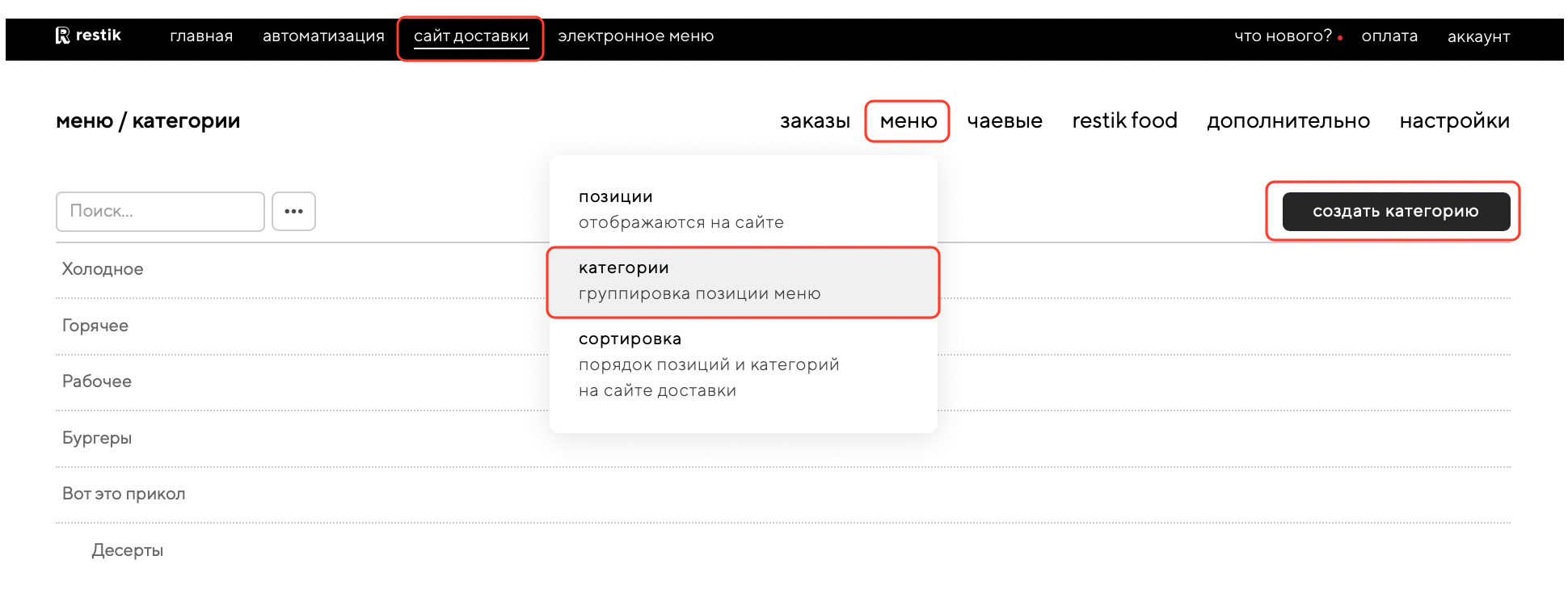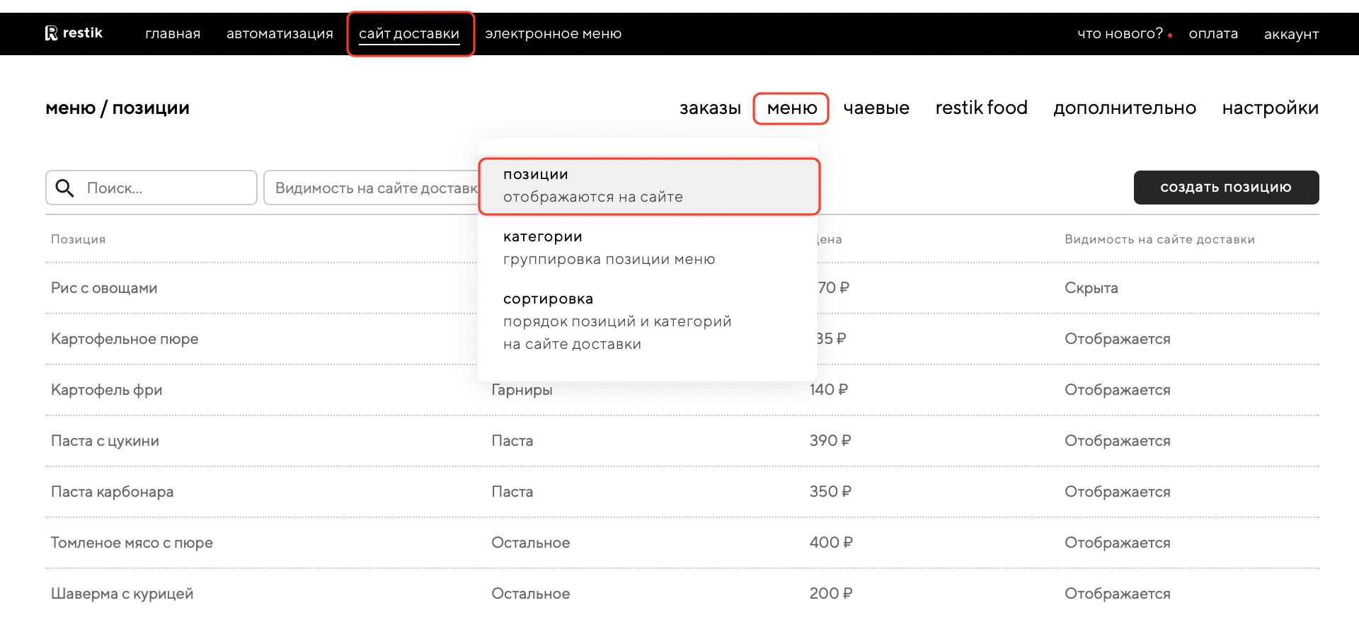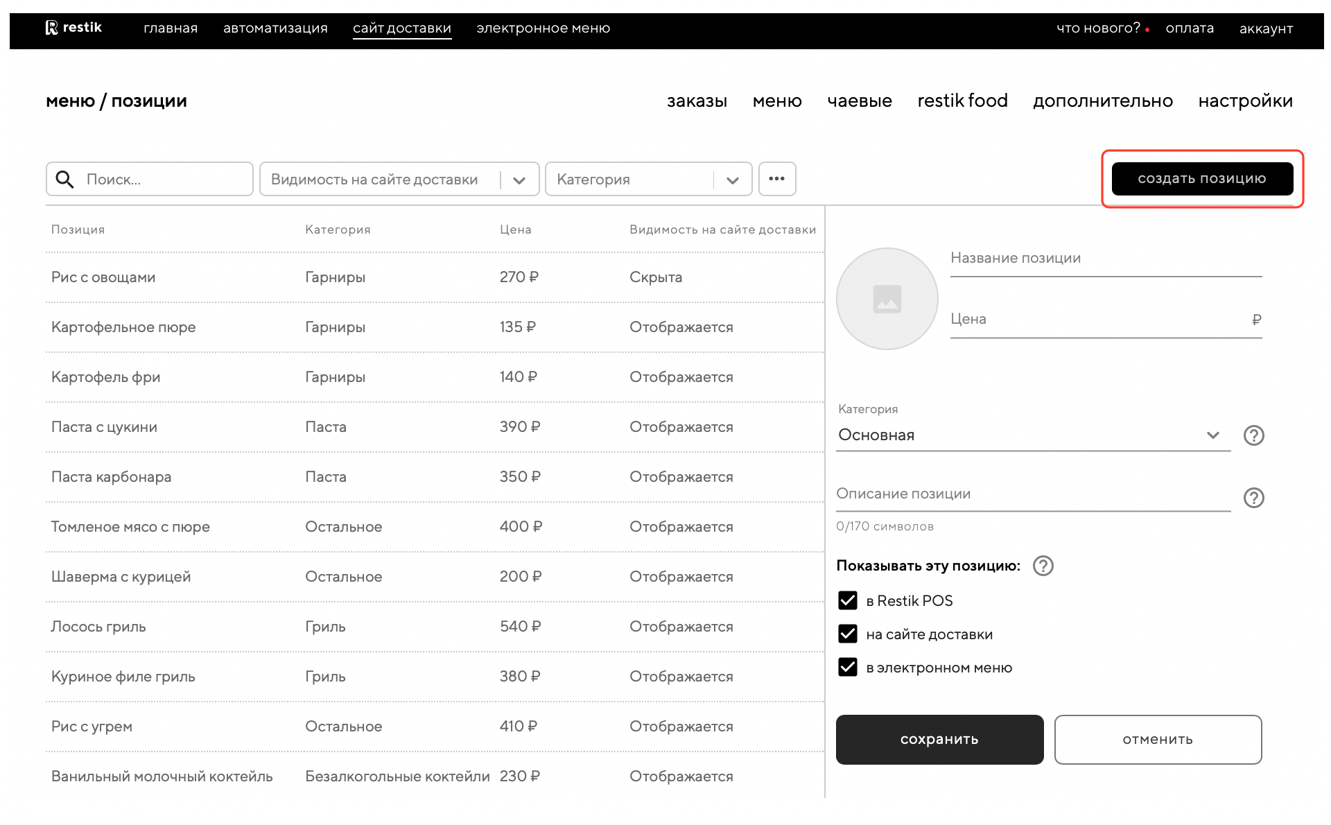 Если вы новый пользователь Restik, перейдите в админку сайта доставки в раздел «меню» — «позиции», чтобы наполнить позиции меню:
