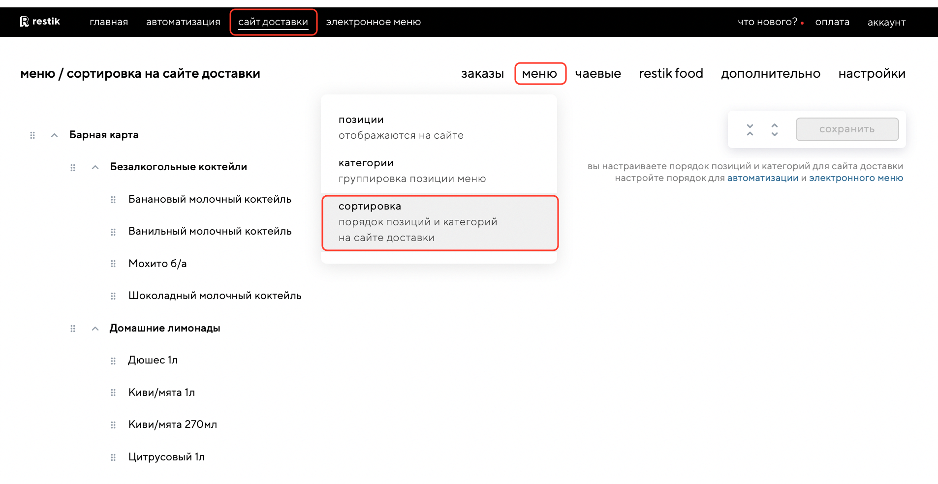 Чтобы задать порядок категорий и позиций, перейдите в раздел «меню» — «сортировка»: