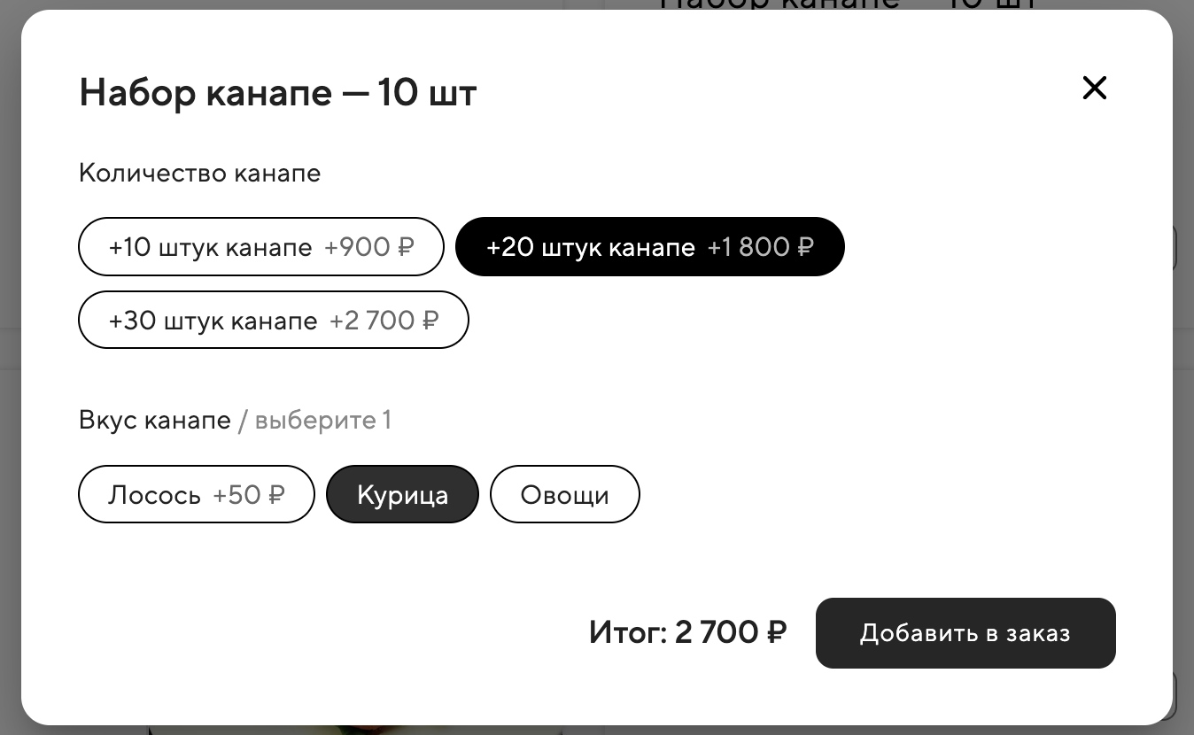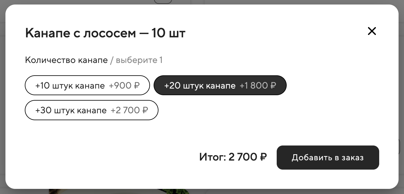 Модификатор позволит гостю добавить нужное количество канапе, и итоговая стоимость заказа изменится автоматически. Например, если гость хочет заказать 30 канапе, он выбирает «Канапе с лососем — 10 шт» и добавляет модификатор «+20 штук канапе». В итоге стоимость заказа составит 2700 рублей за 30 штук. Как выбор выглядит для гостя: