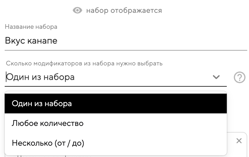 Для модификатора «Вкус канапе» подойдёт вариант «Один из набора», так как количество уже указано в названии позиции, и гостю нужно выбрать ровно один вкус.