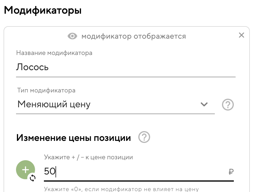 Если цена должна меняться в зависимости от выбранного вкуса, укажите тип модификатора: «Меняющий цену». Например, модификатор «Лосось» увеличивает цену на 50 рублей. Подробнее про создание модификаторов рассказываем по ссылке.