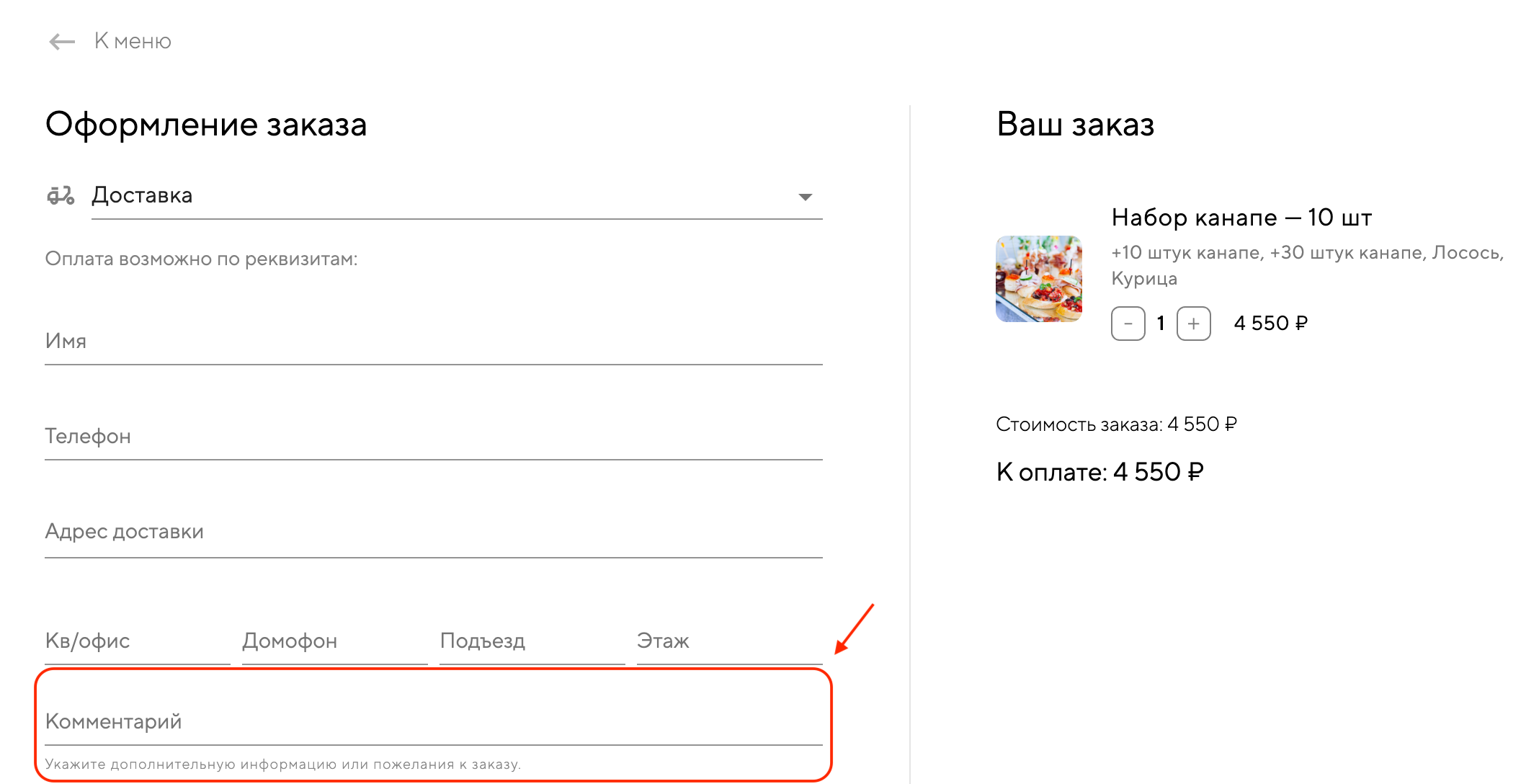 Если гость заказал разное количество и вкусы, то в комментарии к заказу при оформлении он может указать подробности, например: 10 штук канапе с лососем и 30 штук с курицей. Также при необходимости можно связаться с гостем по номеру телефона, указанному в заказе, чтобы уточнить состав.