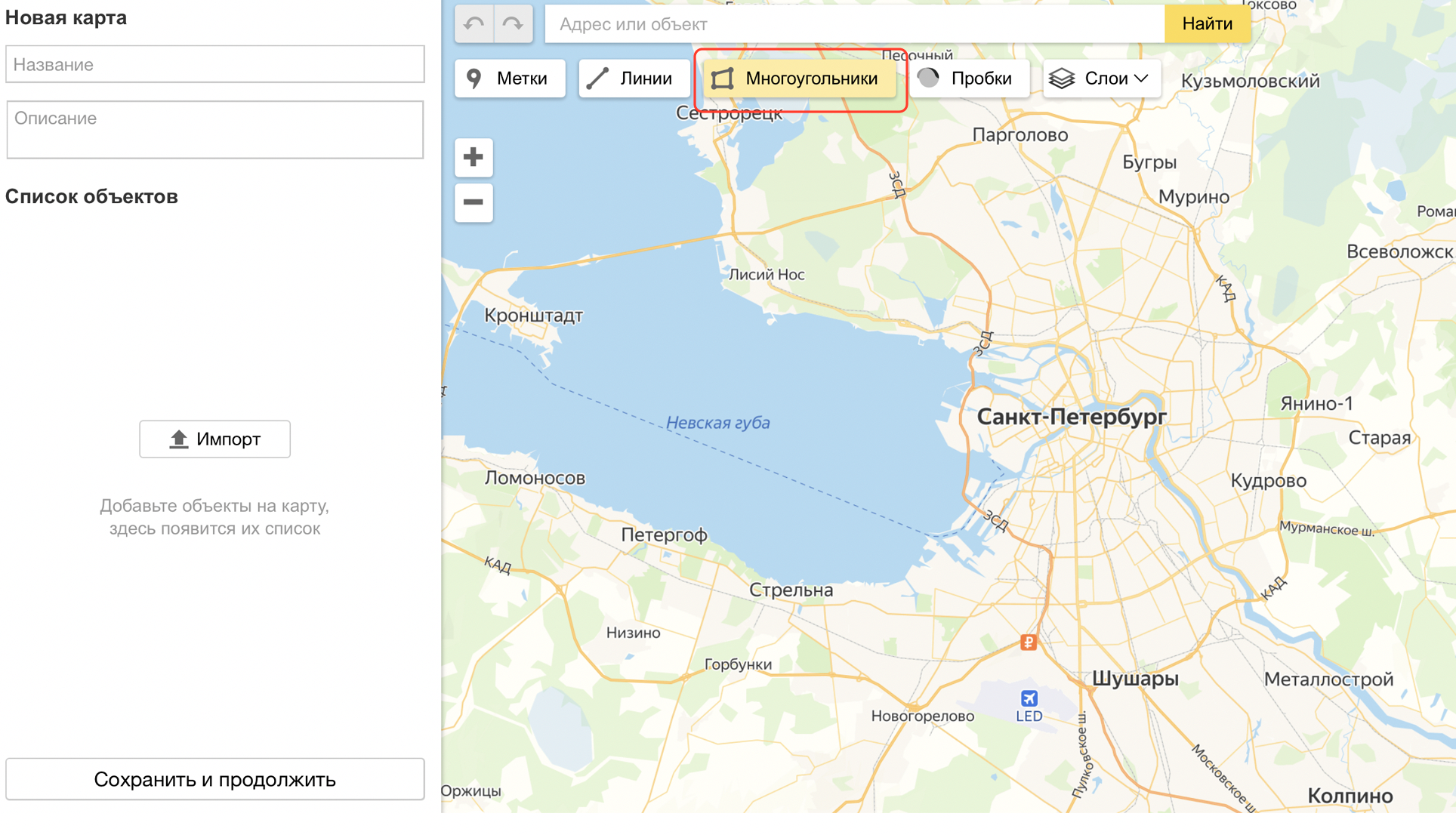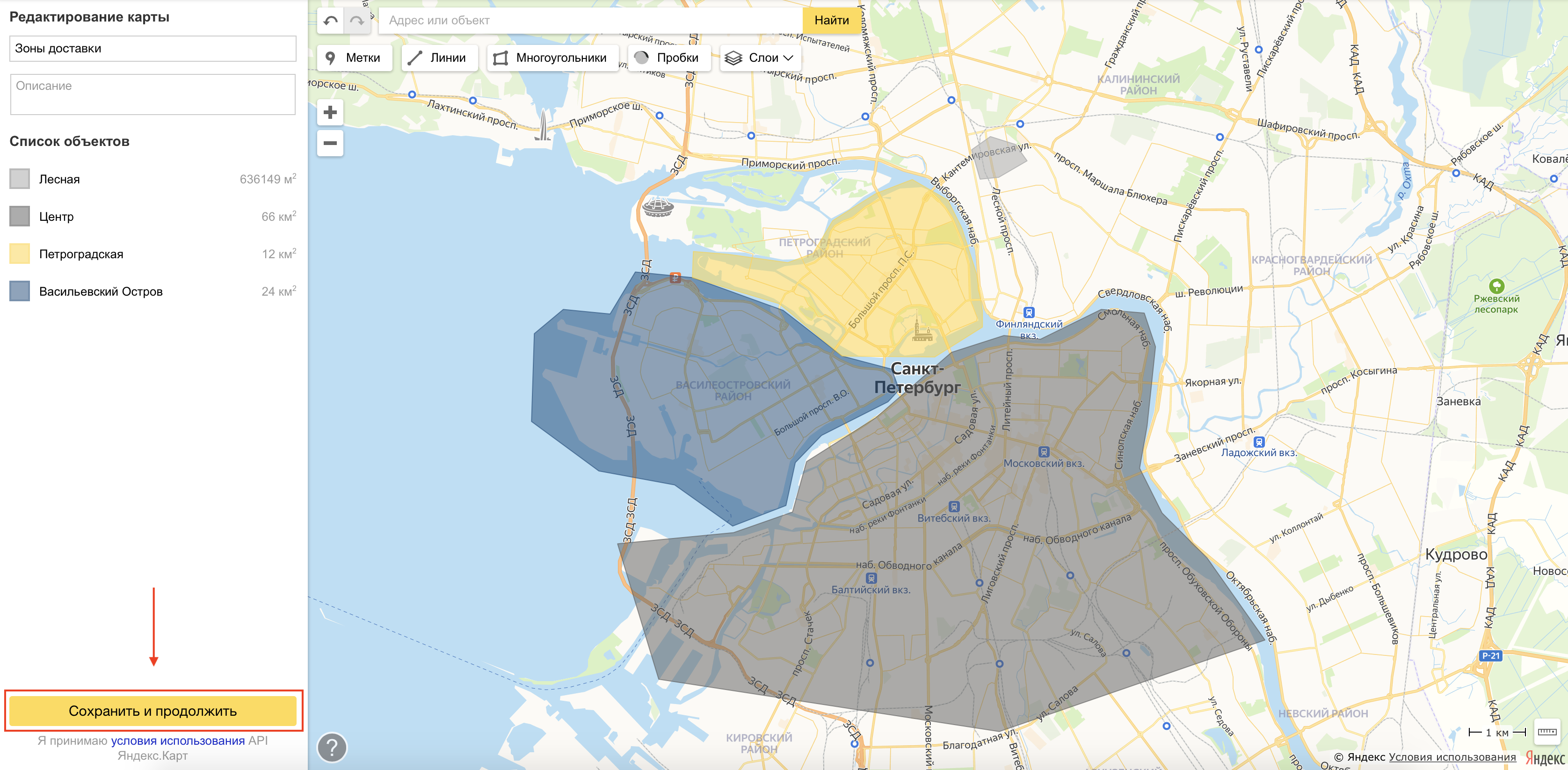 💡Важно выбрать инструмент «Многоугольники» для рисования зон доставки. Если вы нарисуете зоны другим инструментом, вы не сможете загрузить карту на сайт доставки: