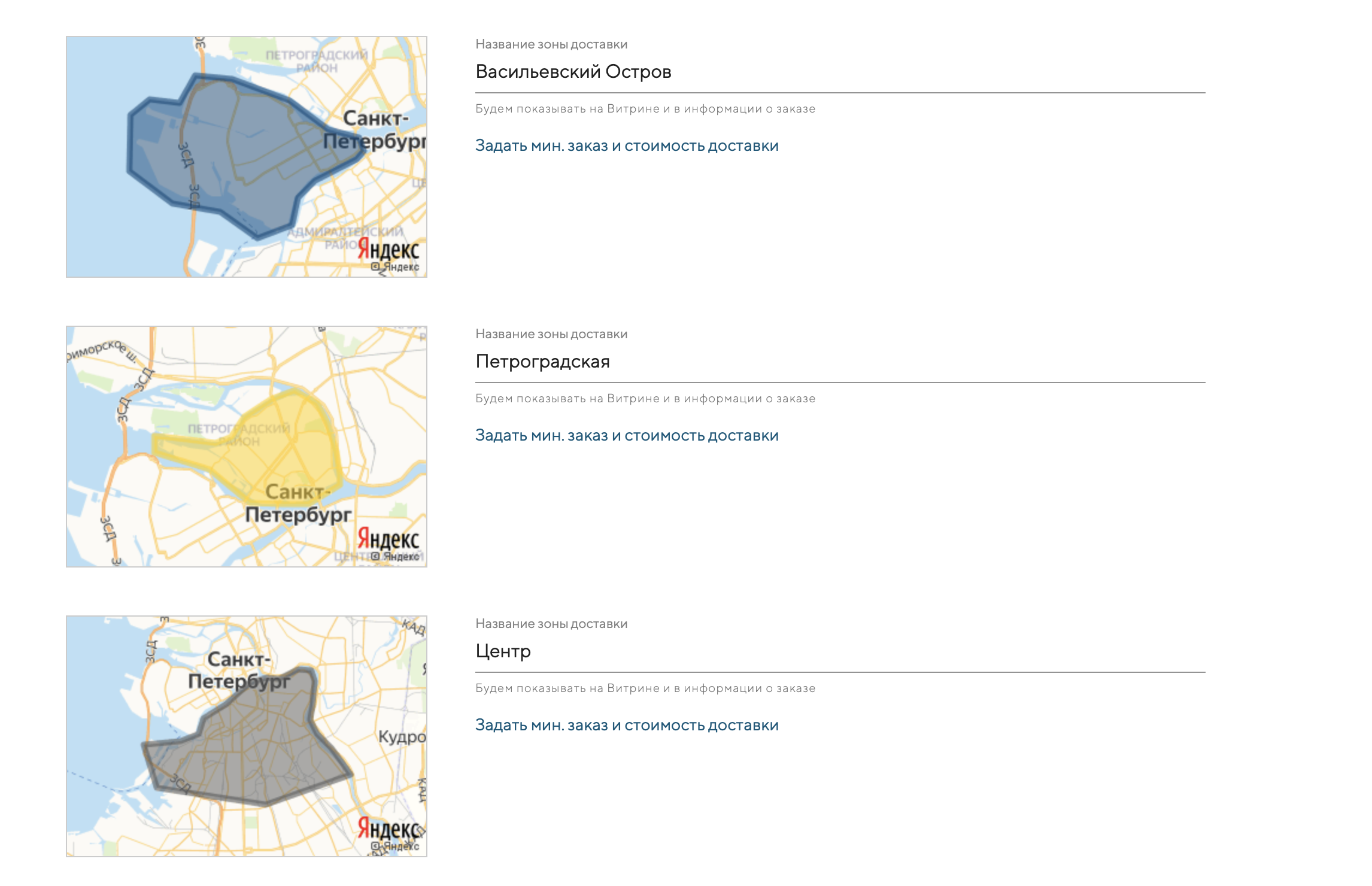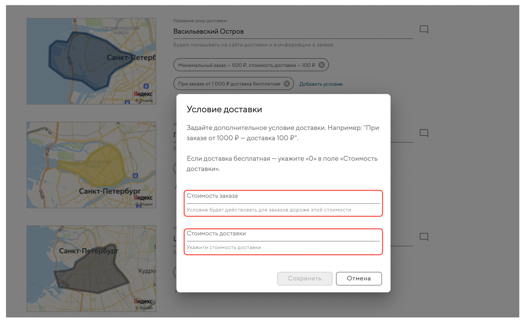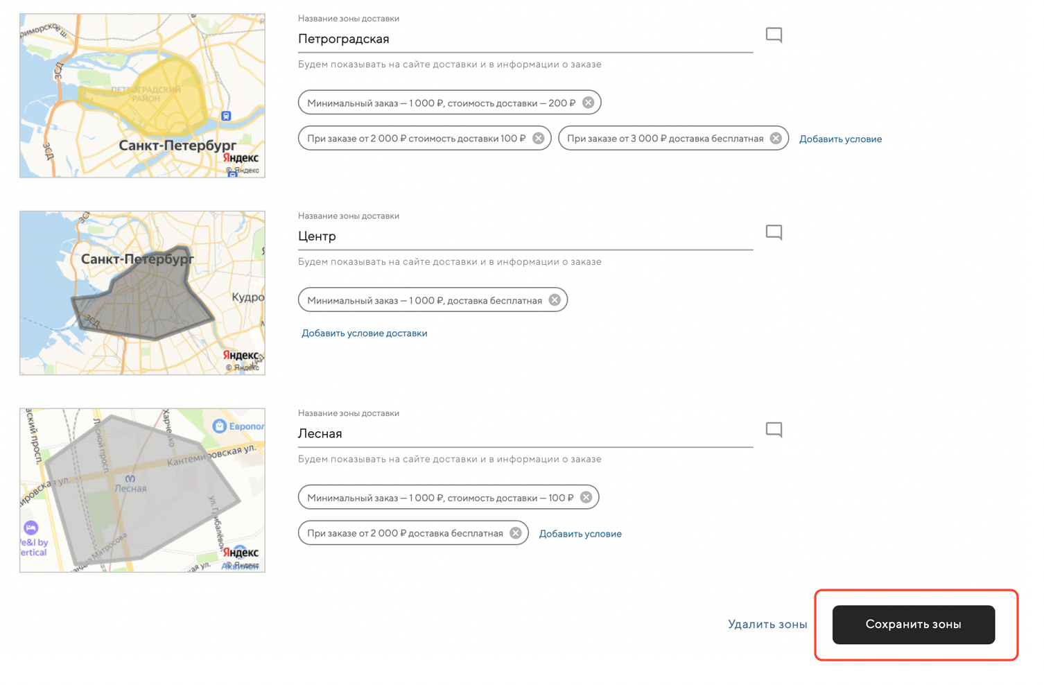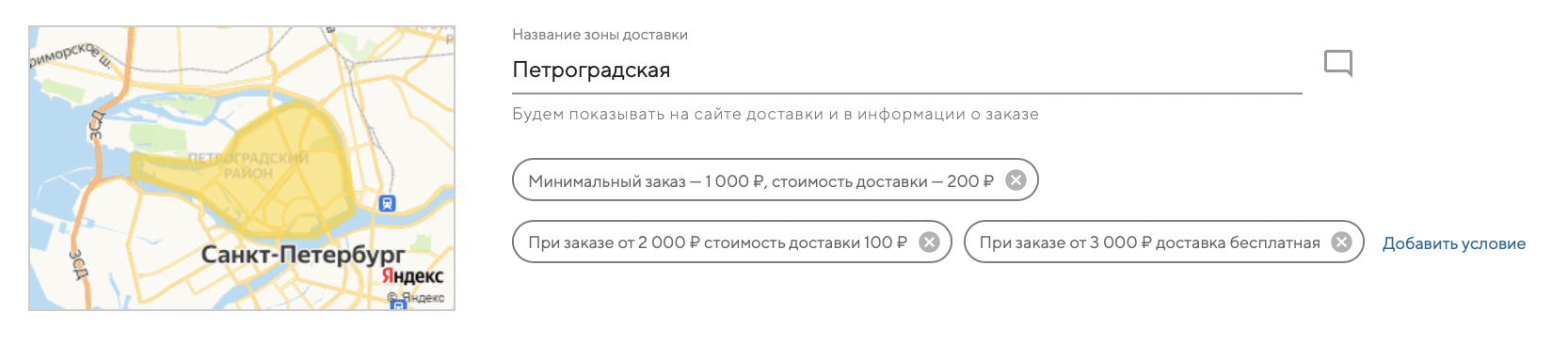 Позже, в админке, вы сможете задать индивидуальные условия для каждой зоны доставки: минимальный заказ, стоимость доставки и зависимость стоимости доставки от стоимости заказа.