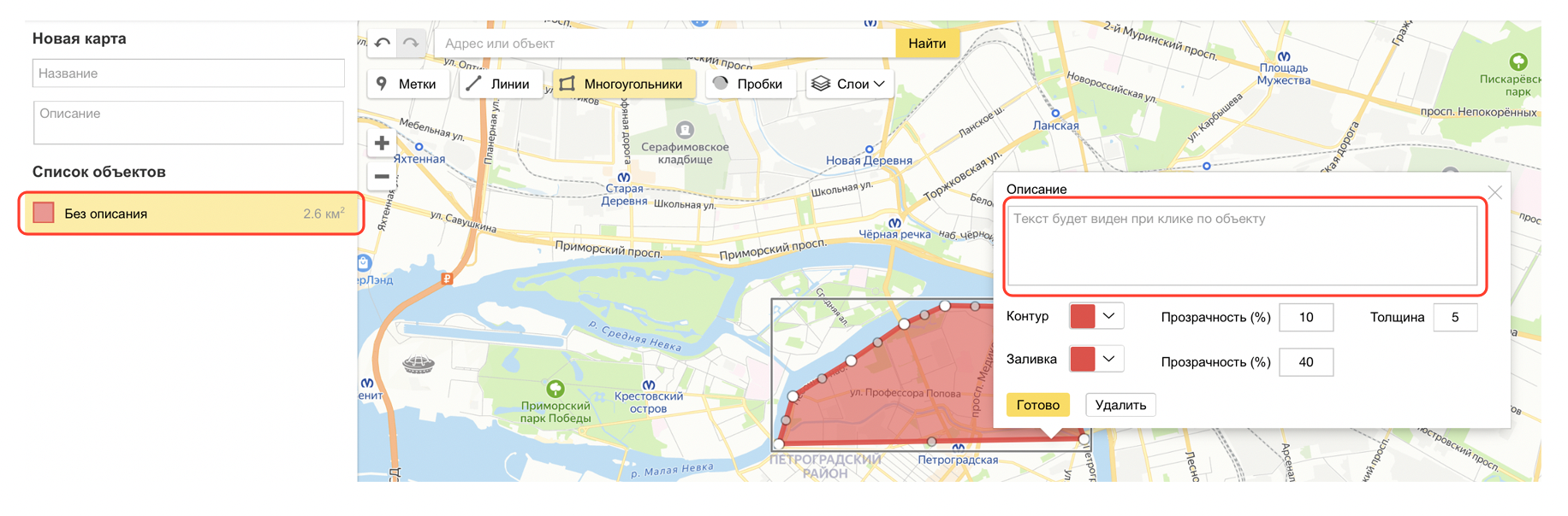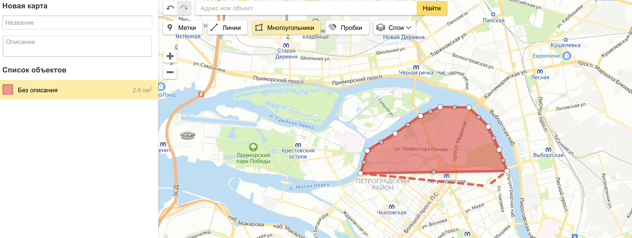 Приблизьте карту, чтобы вам было удобно проставлять точки контура зоны и нарисуйте её: