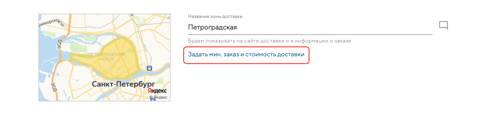 Чтобы задать условия доставки для зоны — нажмите кнопку «Задать мин. заказ и стоимость доставки»:
