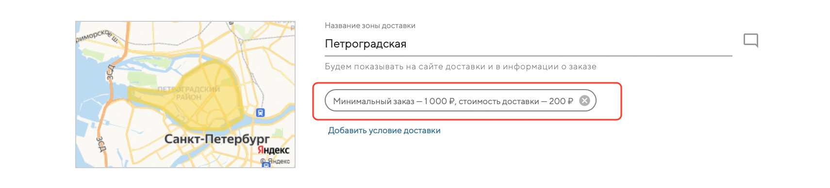 Нажмите на кнопку «Сохранить». Теперь, если адрес гостя находится в зоне доставки «Петроградская» — сделать заказ можно будет на сумму дороже 1000₽. Стоимость доставки составит 200₽ и будет автоматически включена в стоимость заказа: