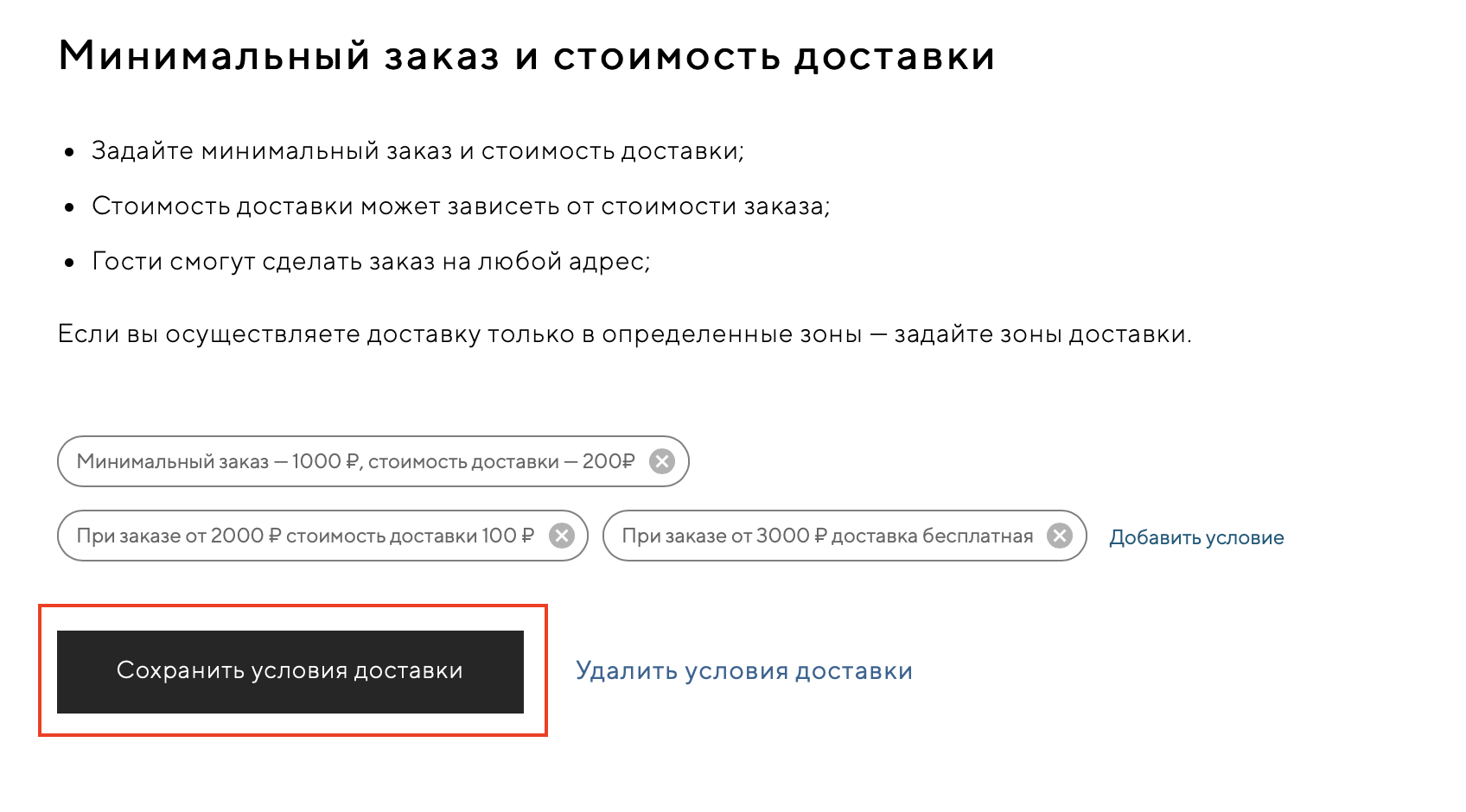 Чтобы задать условия доставки — нажмите кнопку «Задать мин. заказ и стоимость доставки».