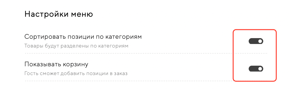 • Если опция отключена, гость сможет просматривать позиции и их описания, но не сможет добавлять их в корзину (у фото позиции не будет значка «+» и не будет корзины совсем).
