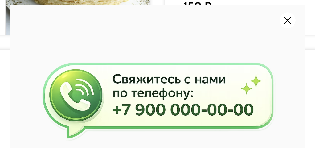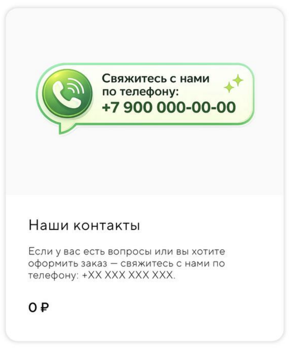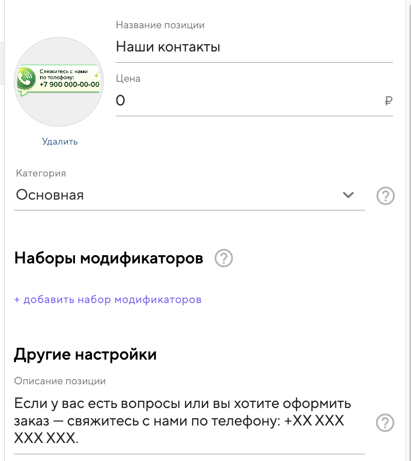 Можно добавить номер телефона как позицию, чтобы гости видели его и могли связаться для оформления заказа. В «Меню — Позиции» создайте позицию, дайте ей название и описание, укажите цену 0 рублей, например: