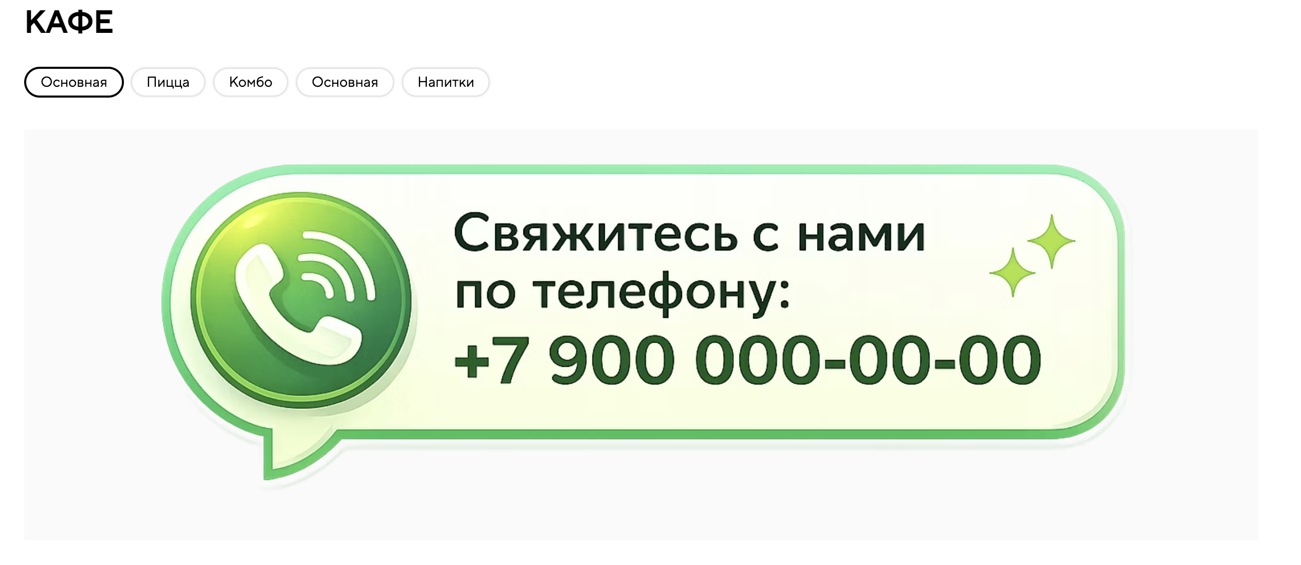 Доступны три формата баннеров: встроенный сверху, встроенный снизу и всплывающий снизу. Вы можете выбрать наиболее удобный вариант размещения и добавить изображение с вашими контактами. Это позволит гостям быстро увидеть информацию для связи. Например, баннер сверху на странице меню: