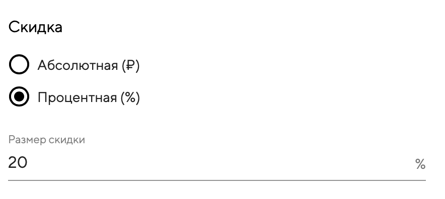 Укажите размер скидки. Скидка может быть абсолютная (₽) или процентная (%). Это обязательное поле.