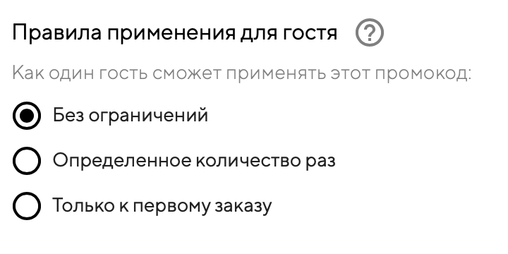 Без ограничений — гость сможет применять этот промокод неограниченное количество раз.
