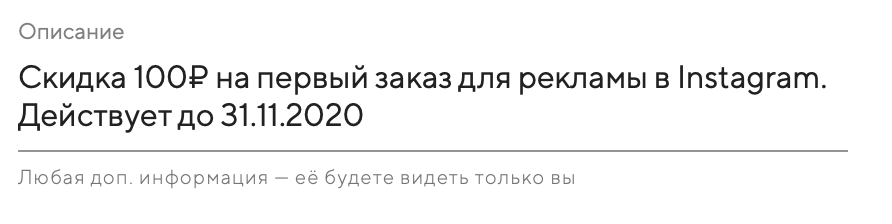 Заполните поле «Описание». Содержимое этого поля будете видеть только вы. Это поле поможет вам отличать промокоды друг от друга и не забывать, какие условия использования заданы.
