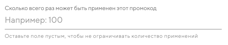 Задайте максимальное количество применений этого промокода всеми гостями. Если оставить это поле пустым — применять промокод можно будет неограниченное количество раз.