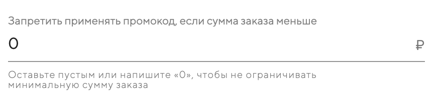 Задайте минимальную сумму заказа для применения этого промокода. Укажите «0» или оставьте поле пустым, чтобы применять промокод можно было к заказу на любую сумму.