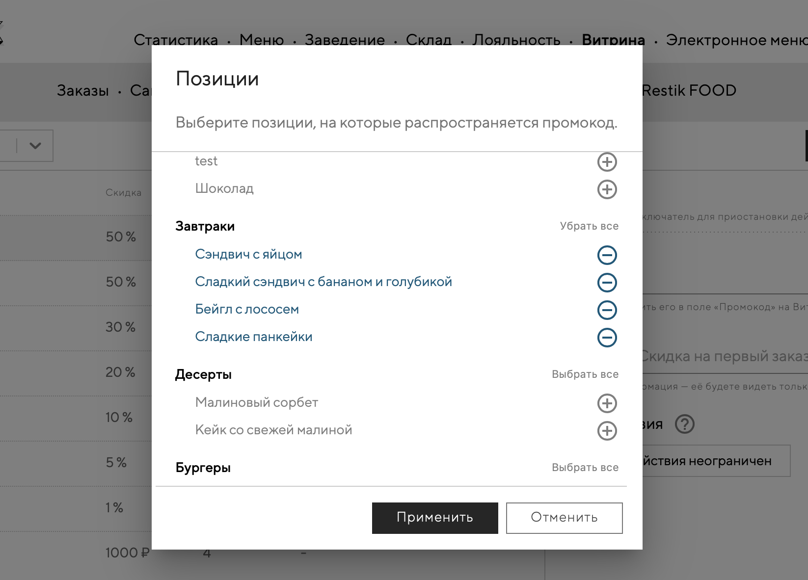 Настройте «позиции», если хотите, чтобы промокод распространялся на конкретные блюда. Если не задать это условие — промокод будет действовать на все меню.