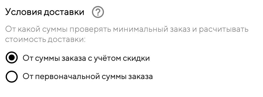 Если на вашем сайте доставки настроены условия доставки — проверка минимальной суммы заказа и расчёт стоимости доставки при применении промокода будет осуществляться либо от суммы заказа с учётом всех скидок, либо от первоначальной суммы заказа (без учёта скидок).