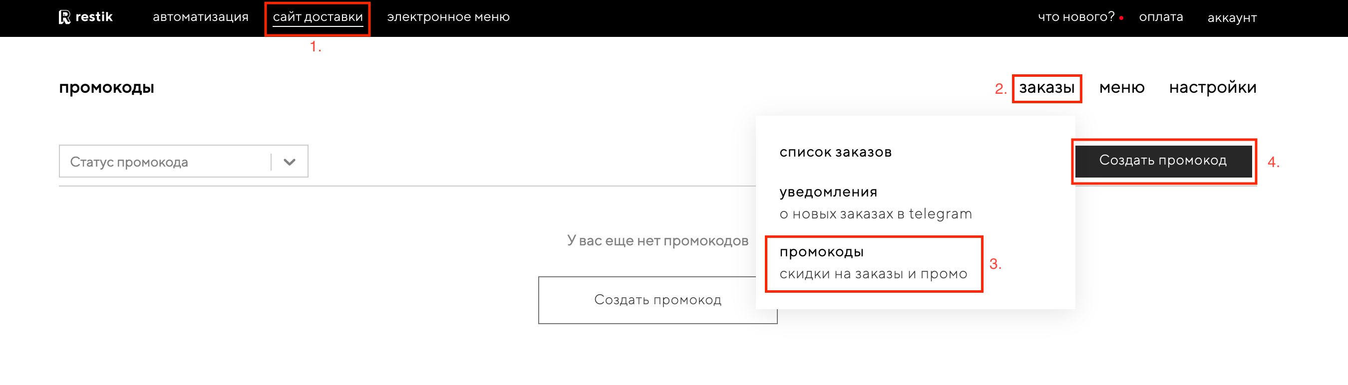 Создайте промокод в админке Restik.