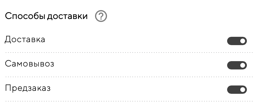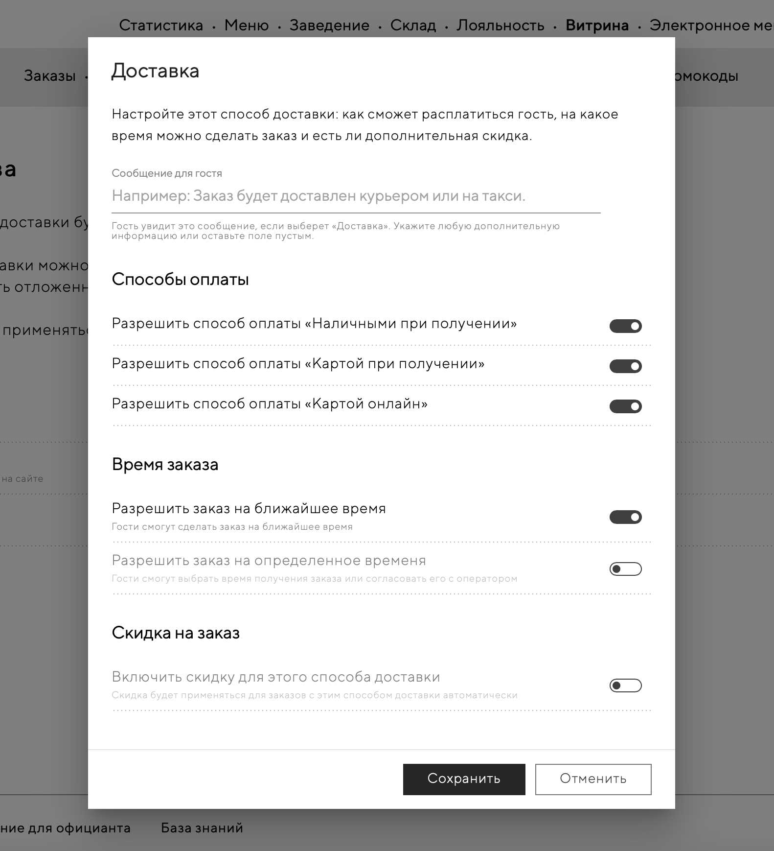 Настройте, как ваши гости смогут делать заказы на сайте доставки: какие способы доставки доступны (доставка, самовывоз, в заведении), какие способы оплаты доступны для каждого из способов доставки, доступен ли отложенный заказ или скидка на заказ.