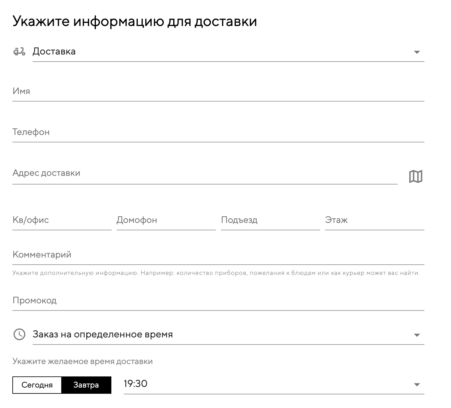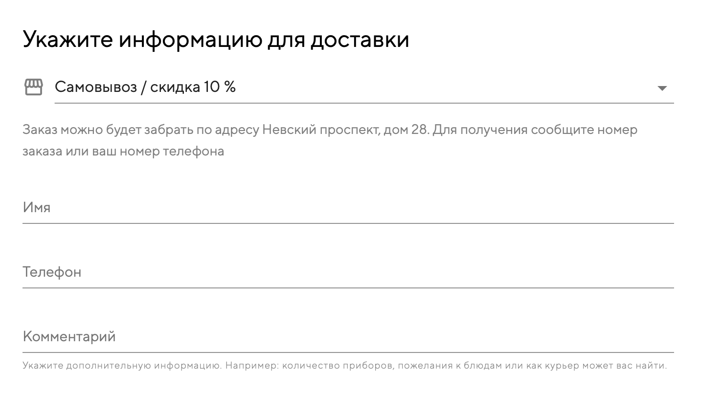 Доставка — подразумевает курьерскую доставку по адресу, который гость укажет в форме заказа;