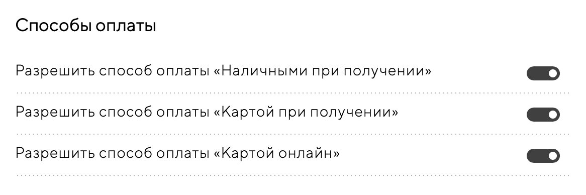 Настройте, какие способы оплаты будут доступны гостю для каждого из способов доставки. Например, для курьерской доставки можно включить только оплату «Картой онлайн», а для самовывоза только «Наличными при получении»
