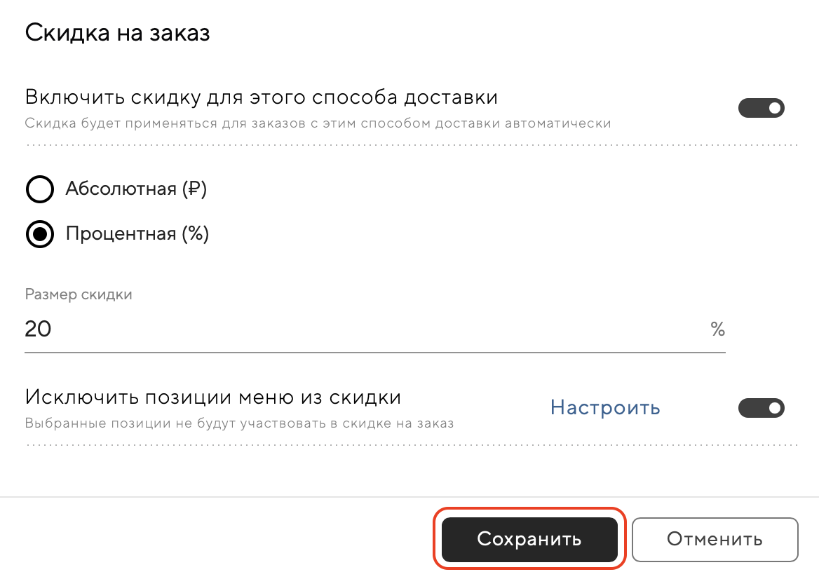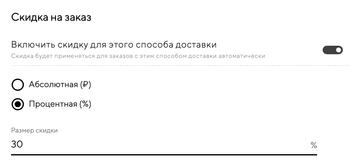 Для каждого из способов доставки можно включить процентную (%) или абсолютную (₽) скидку: