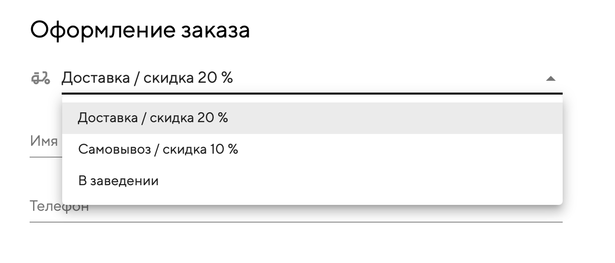 Например, можно разрешить делать заказы только на самовывоз со скидкой 10% и оплатой наличными. Или разрешить делать заказы на доставку и самовывоз, доставка может быть доступна только на ближайшее время и без скидки. Вы можете конфигурировать любые удобные для вас варианты заказов.