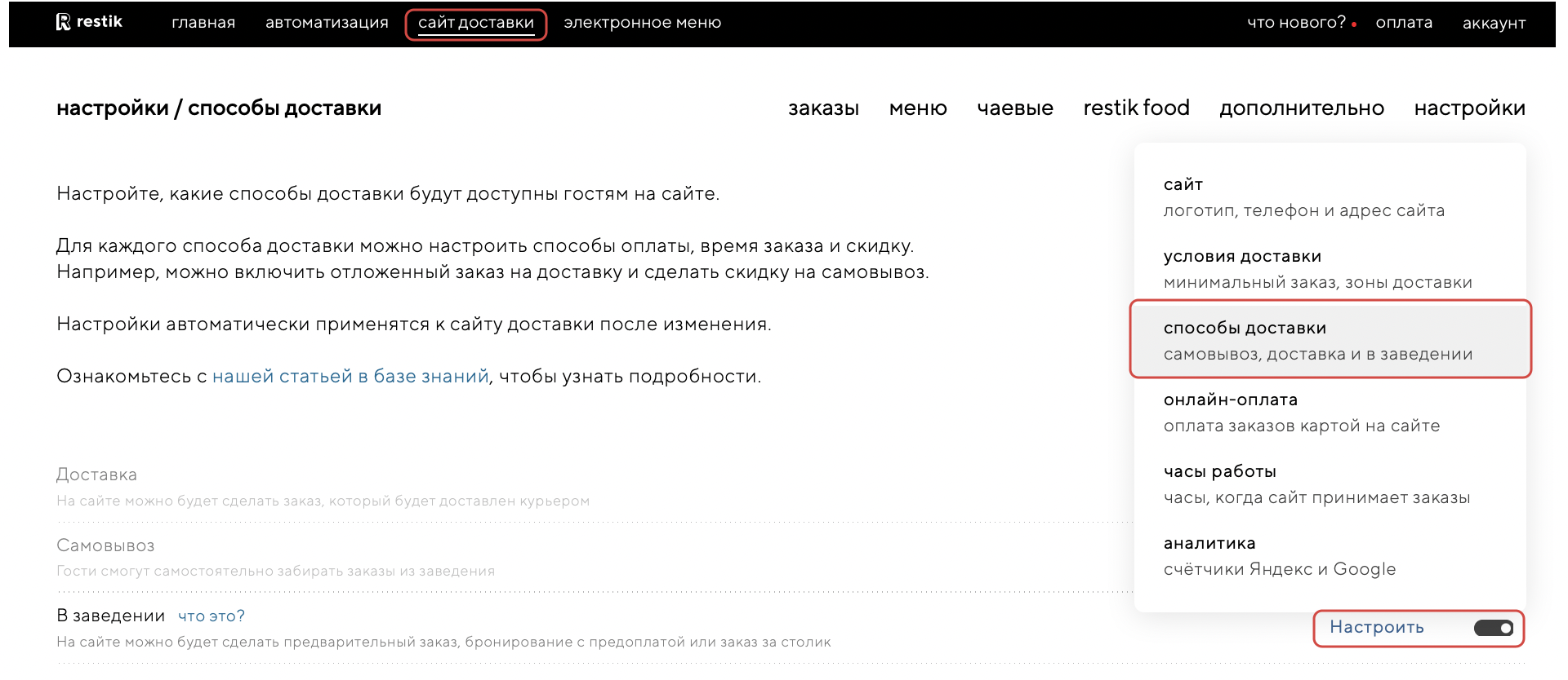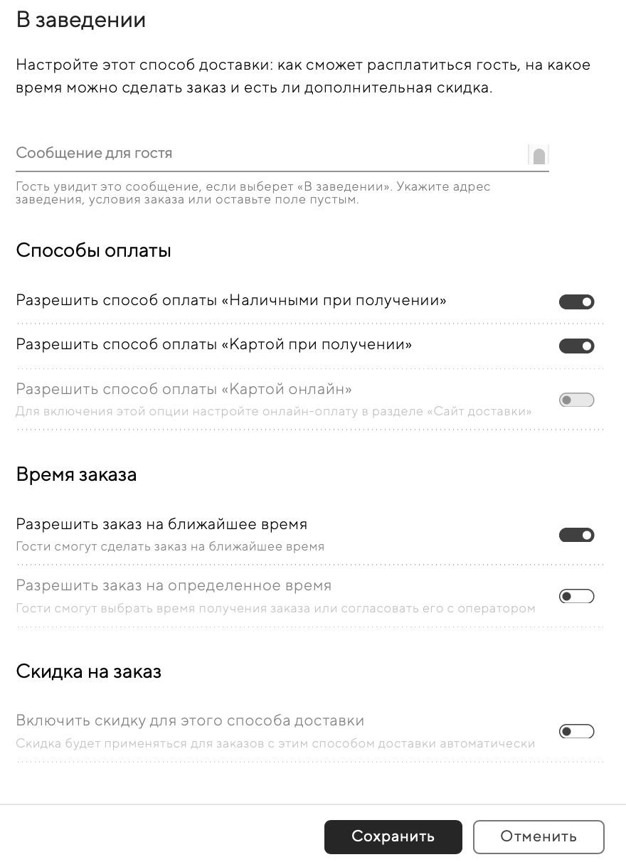 Включите способ доставки «В заведении» и нажмите на кнопку «Настроить», чтобы настроить: как сможет расплатиться гость, на какое время можно сделать заказ и есть ли дополнительная скидка: