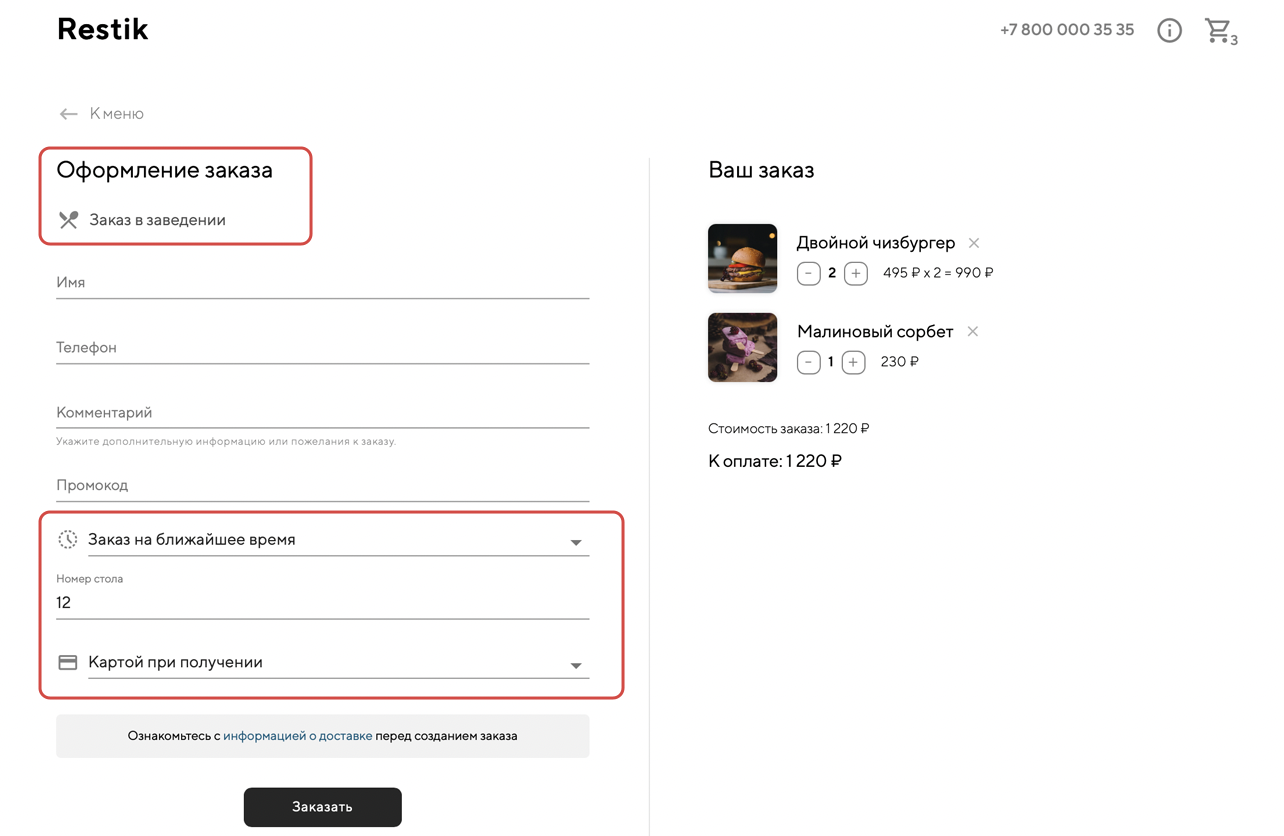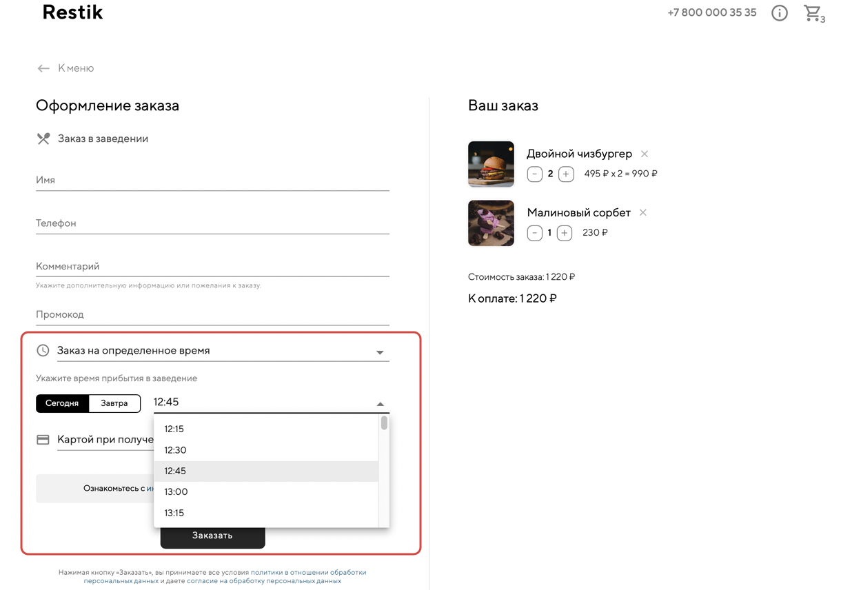 В Restik пока нет функции приёма бронирований, но вы можете реализовать некоторые сценарии с помощью функции «заказ в заведении» на сайте доставки.