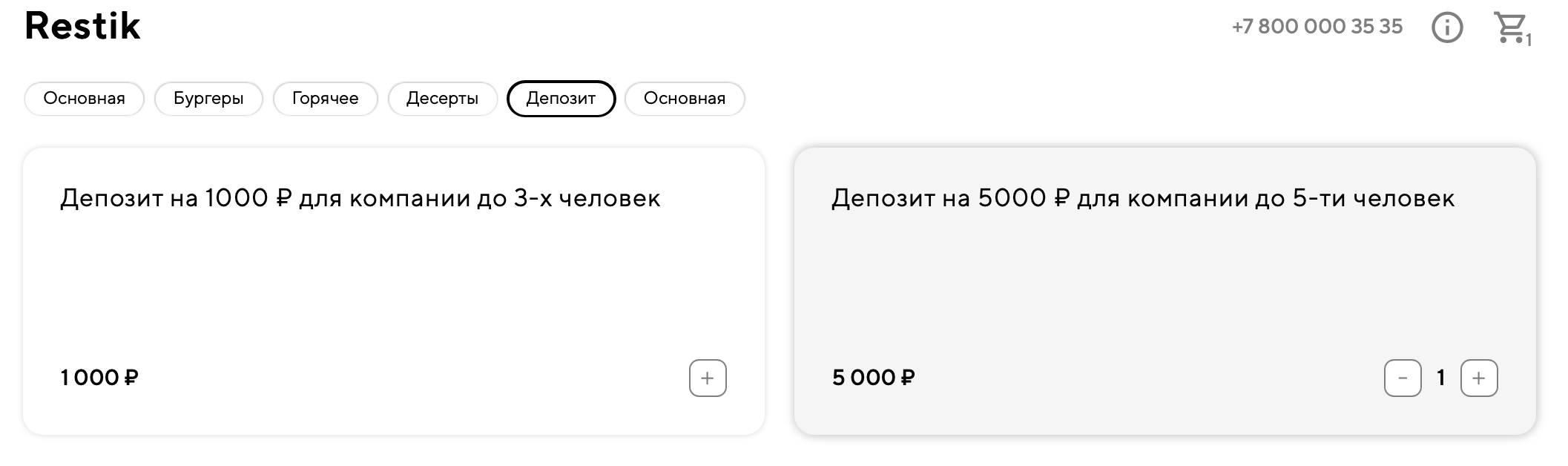 Если вы не используете сайт доставки в классическом виде, например для курьерской доставки или самовывоза, то можете настроить ваше меню так, чтобы в нем вместо блюд отображались депозиты на разные суммы. Например: «Депозит на 1000 ₽ для компании до 3-х человек» и «Депозит на 5000 ₽ для компании до 5-ти человек»: