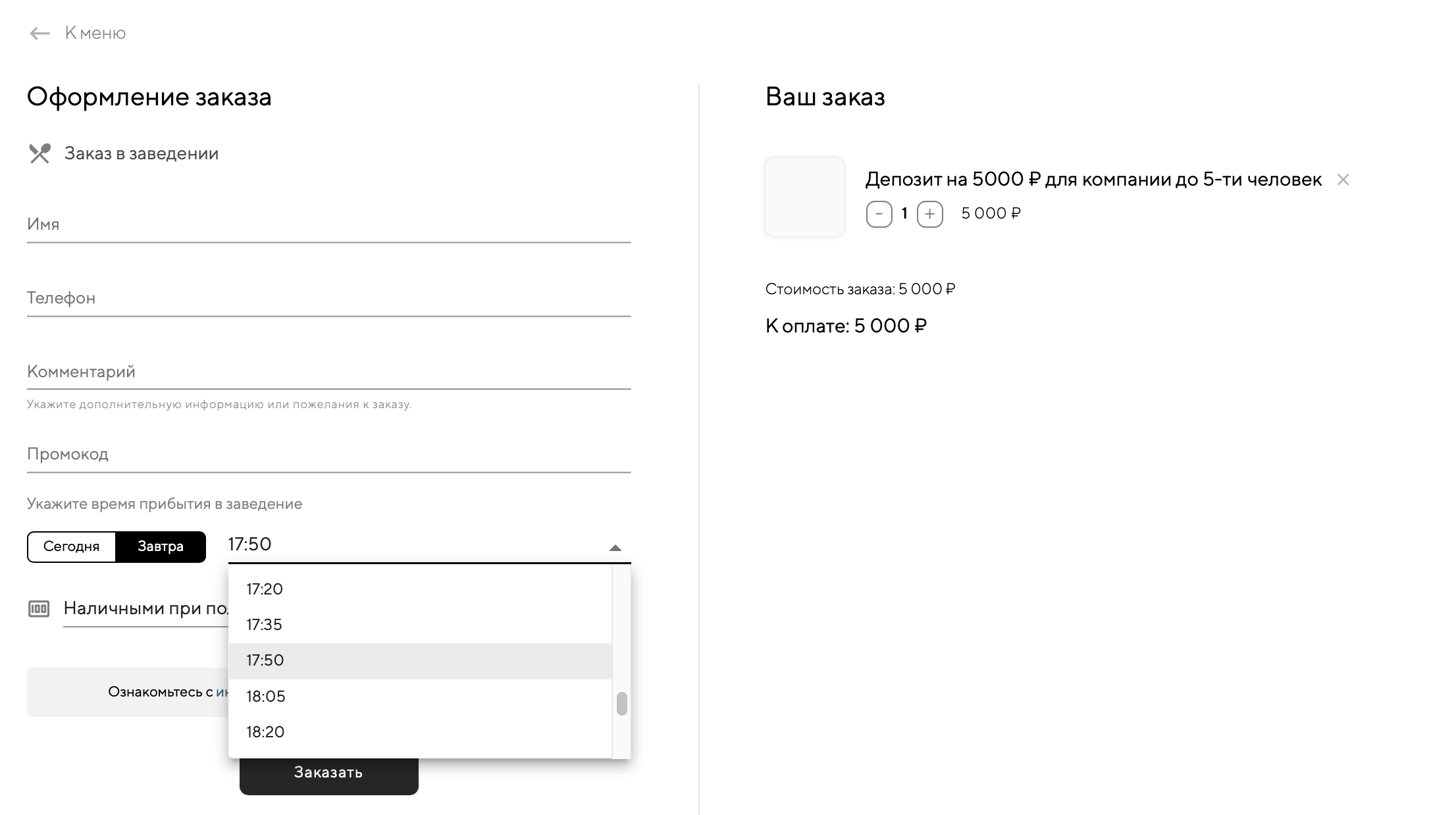 Гость хочет сходить на обед в ваш ресторан во время перерыва и потратить на это минимум времени. Он переходит на сайт заведения, выбирает блюда из меню, выбирает способ доставки «В заведении» и время прибытия. Гость может оплатить заказ онлайн, если такая опция включена в настройках: