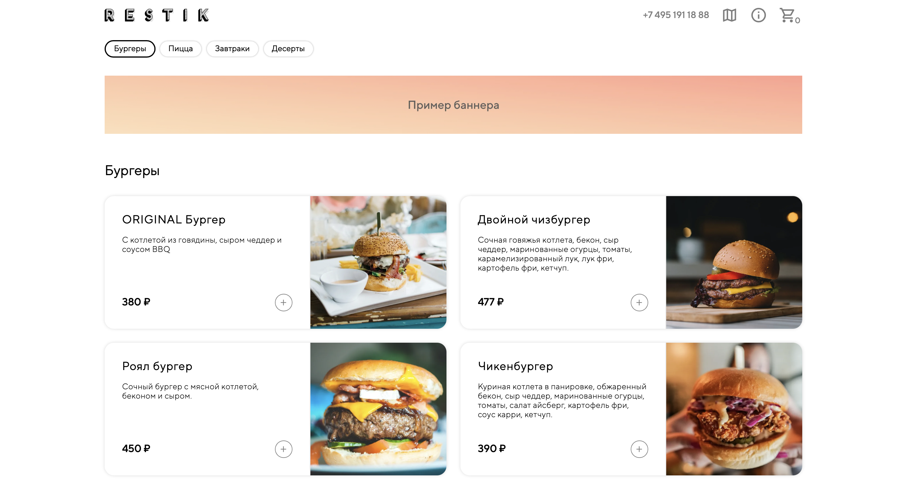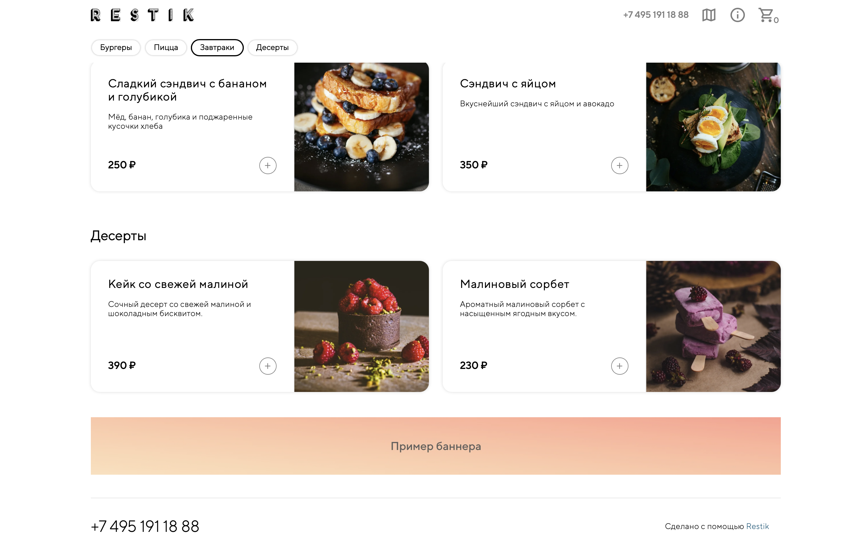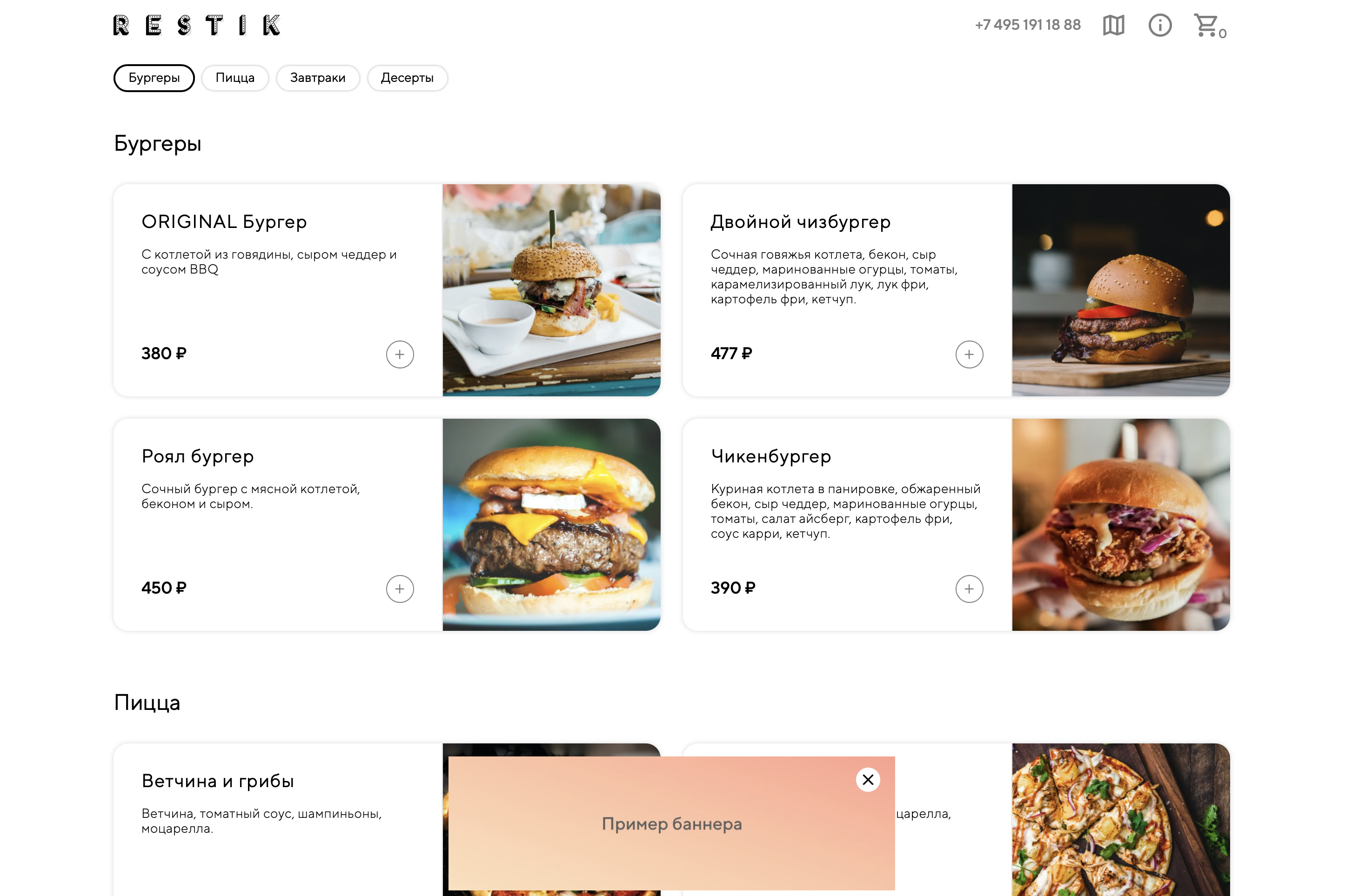 Баннеры — это маркетинговые изображения или видео, которые вы можете разместить на сайте доставке, на странице меню или в корзине. С помощью баннера можно рассказать гостям о новой акции, поделиться промокодом или предложить подписаться на аккаунты заведения в социальных сетях.