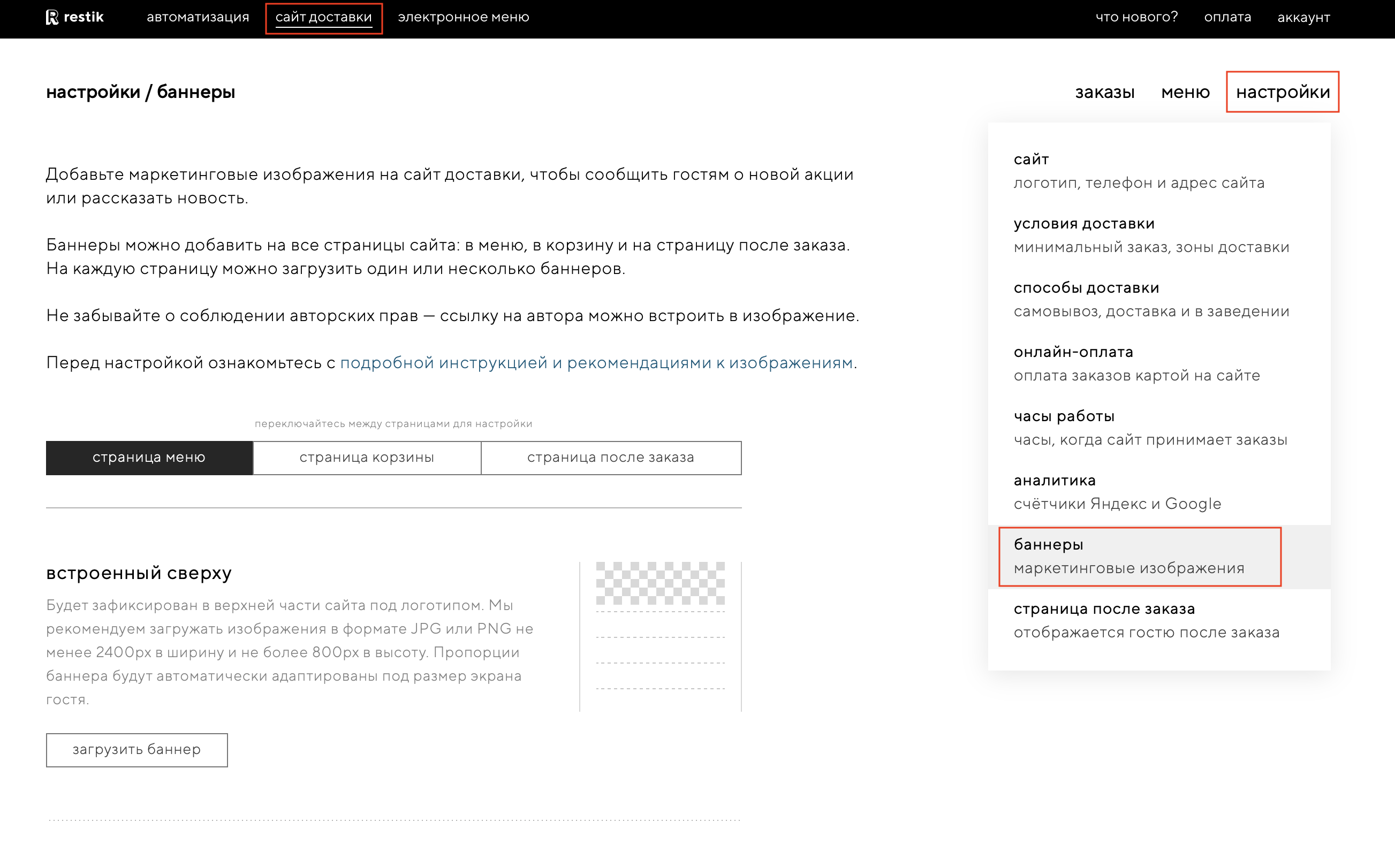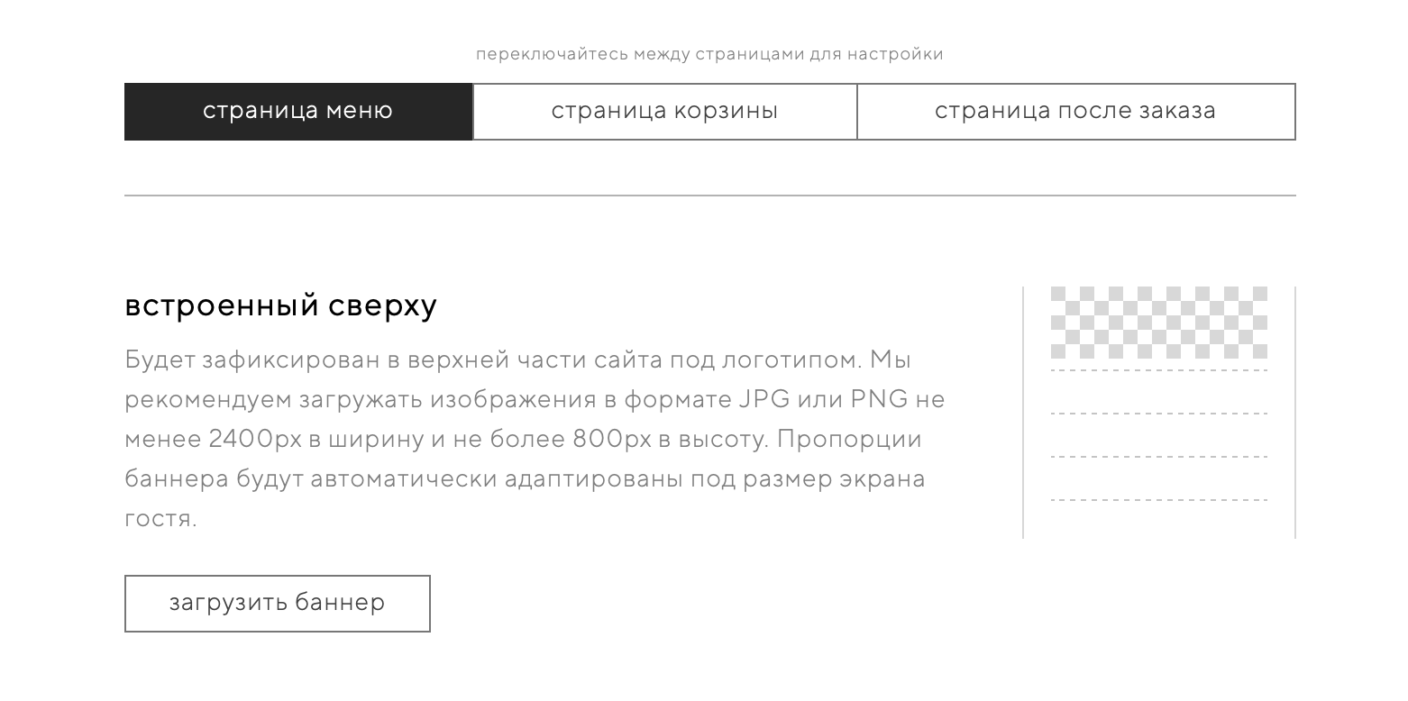 Чтобы загрузить баннер, выберите нужную страницу: корзина, страница меню или страница после заказа. Затем выберите нужный формат и нажмите на кнопку «загрузить баннер».