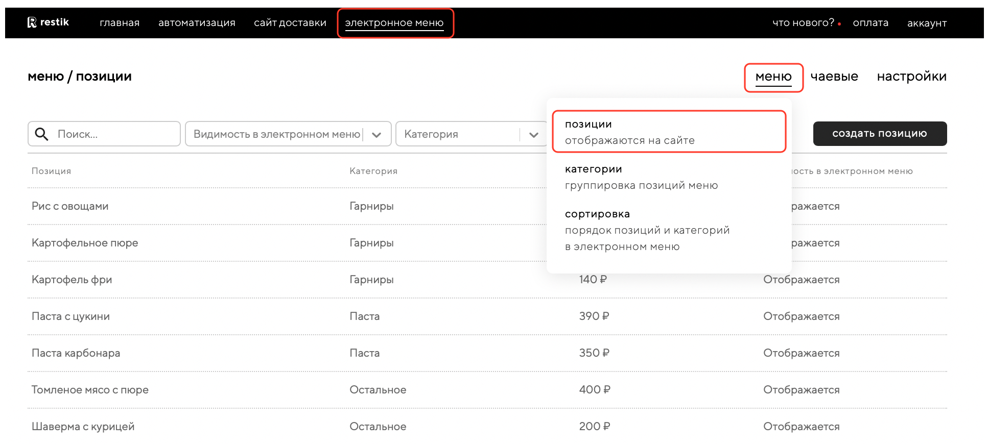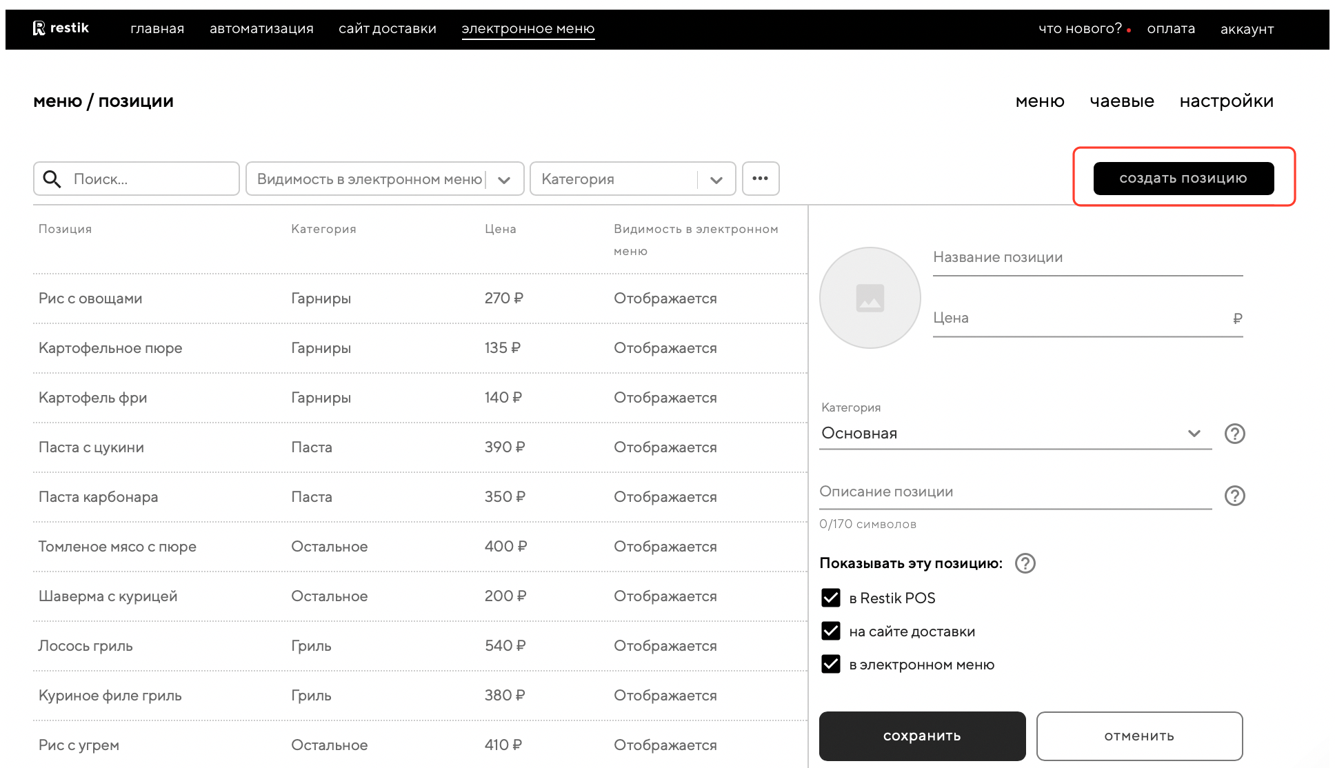 Если вы новый пользователь Restik, перейдите в админку электронного меню в раздел «меню» — «позиции», чтобы наполнить позиции меню: