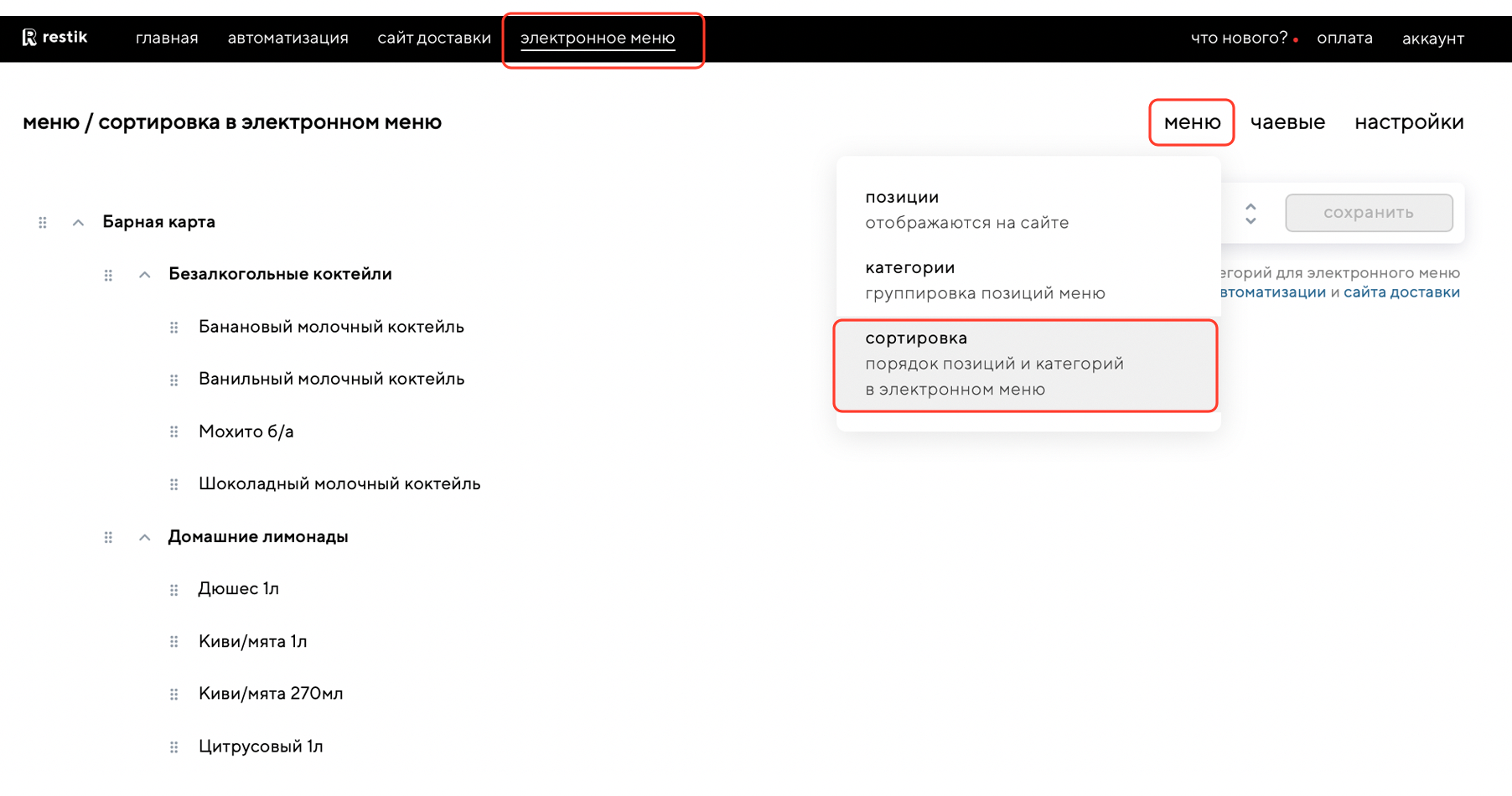 Чтобы задать порядок категорий и позиций, перейдите в раздел «меню» — «сортировка»: