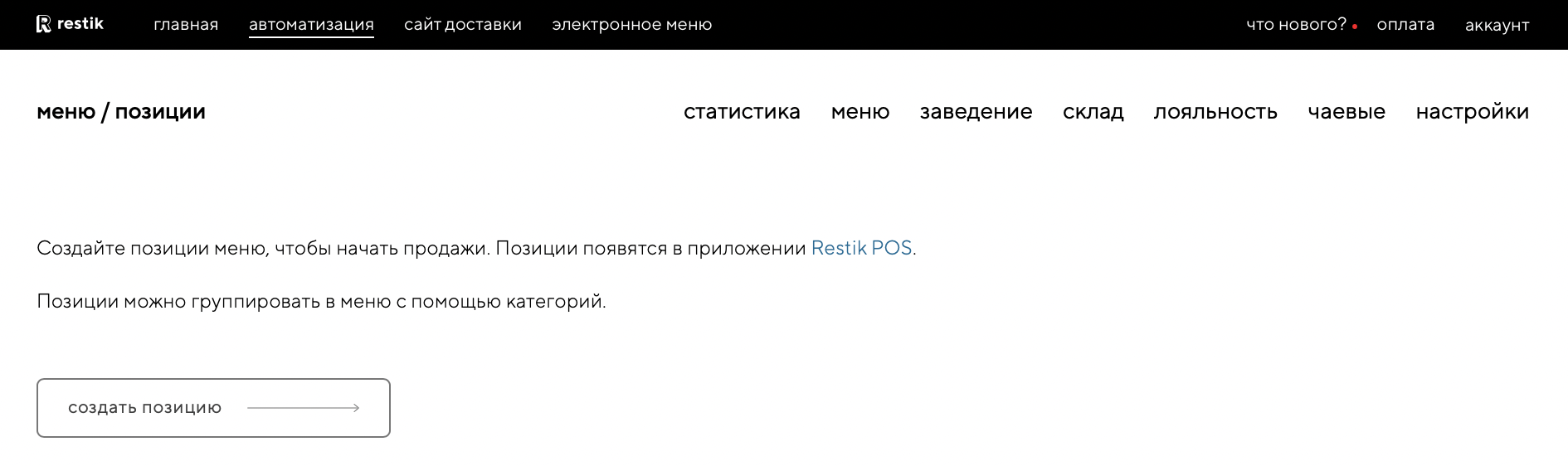 Создайте товары и блюда, они являются продаваемыми позициями и становятся доступными для заказа в приложении Restik POS (терминале).
