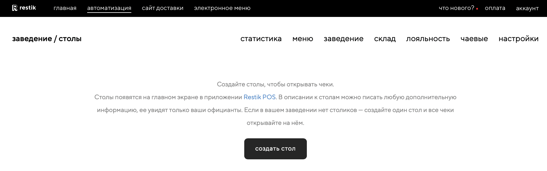 Независимо от наличия или отсутствия посадочных мест в заведении, вам потребуется создать столы в Restik, чтобы открывать чеки. Если в вашем заведении нет посадочных мест, или вы работаете навынос — можно создать один стол и все чеки открывать на нем.