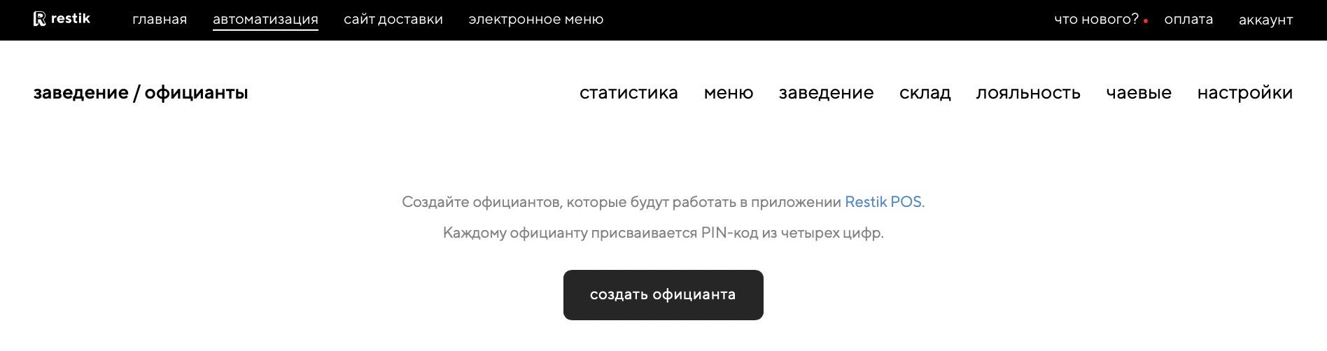 Создайте официантов, чтобы начать работу в приложении Restik POS (терминале). Вы сможете принимать заказы у гостей и отправлять их на кухню, печатать пречеки и фискальные чеки, также составлять отчеты и смотреть статистику продаж по каждому официанту.
