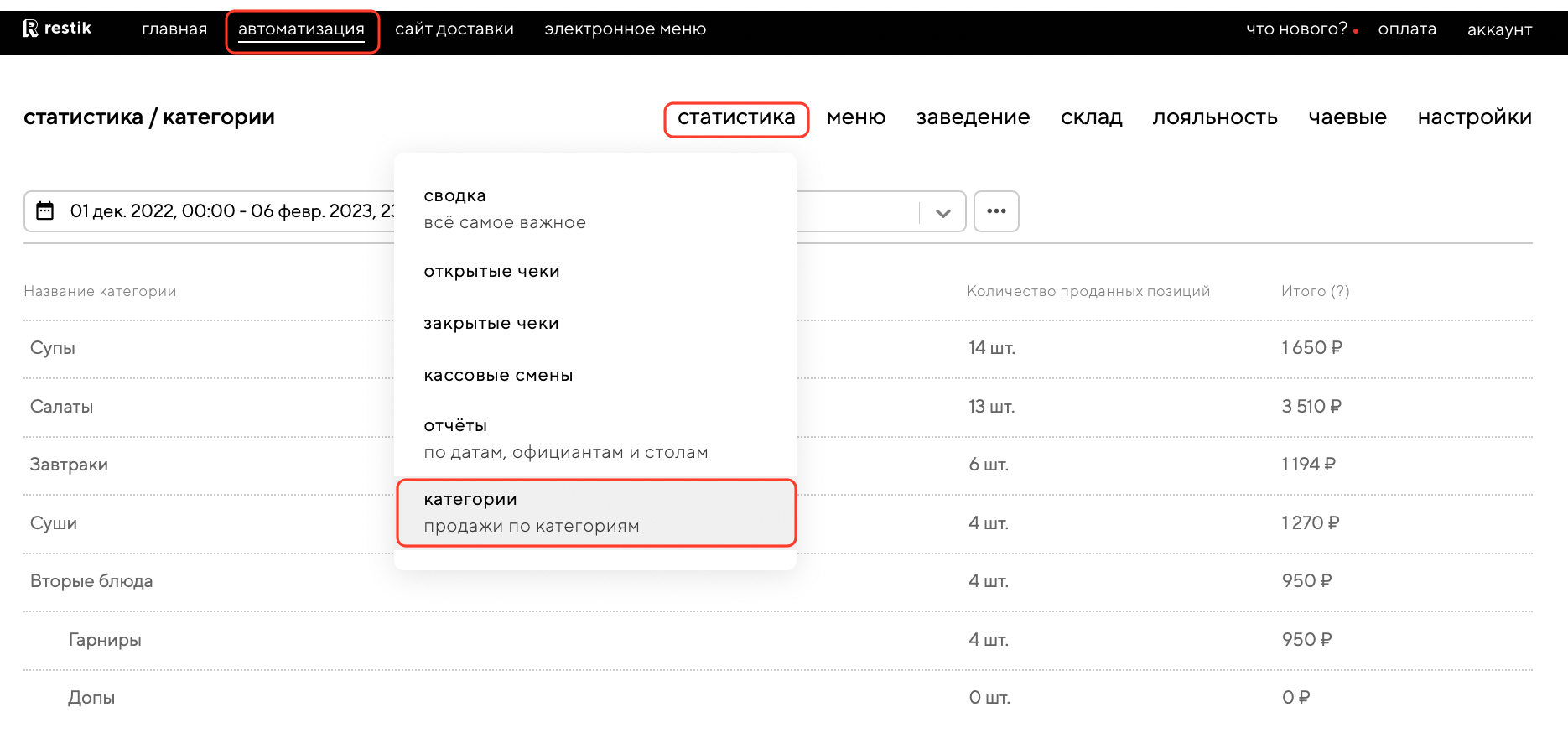 Чтобы посмотреть отчеты продаж по категориям, перейдите в админку автоматизации в раздел «статистика» — «категории»: