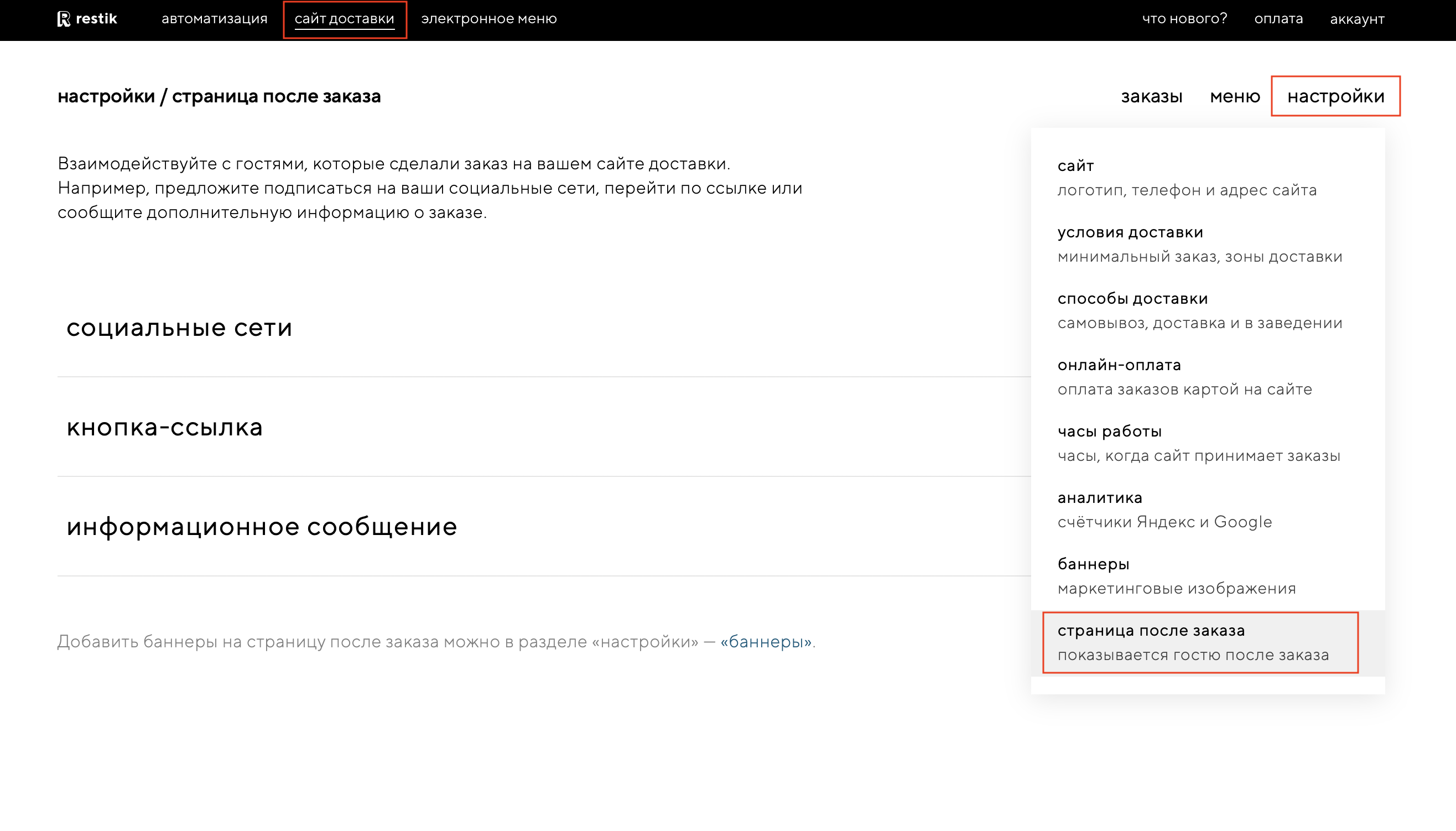 Чтобы настроить страницу после заказа, перейдите в админку сайта доставки в раздел «настройки» — «страница после заказа».