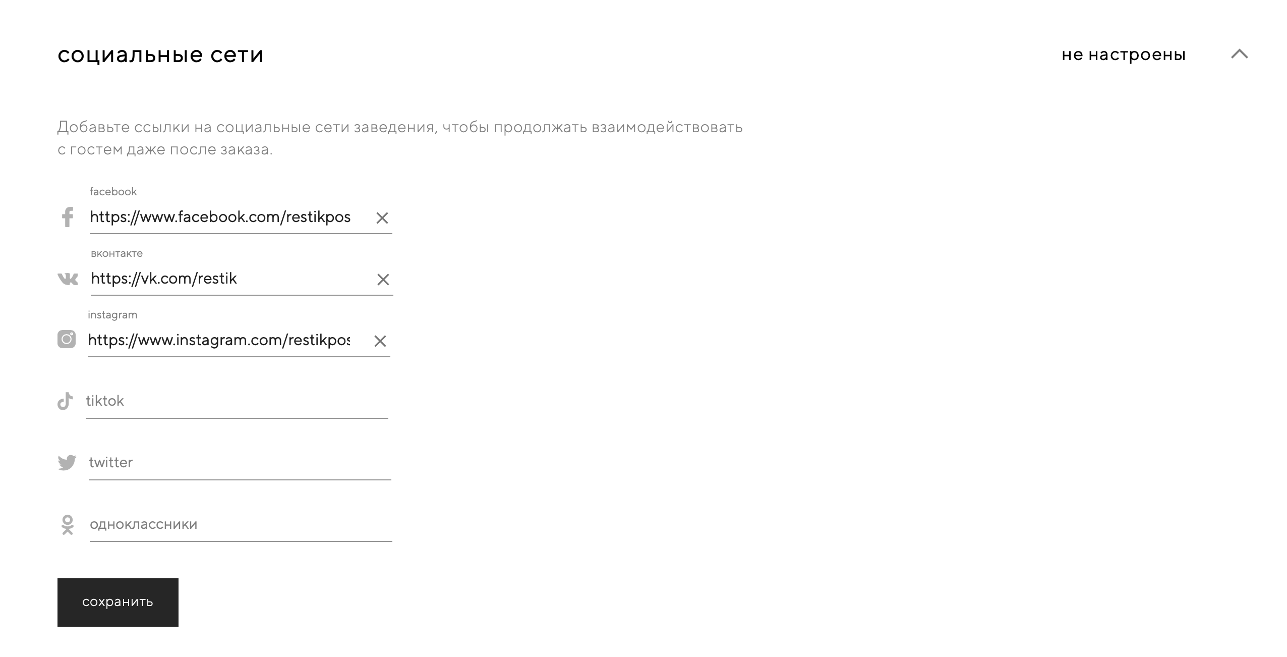 Добавьте ссылки на социальные сети заведения, чтобы продолжать взаимодействовать с гостем даже после заказа и возвращать гостей для совершения повторных заказов на вашем сайте доставки.