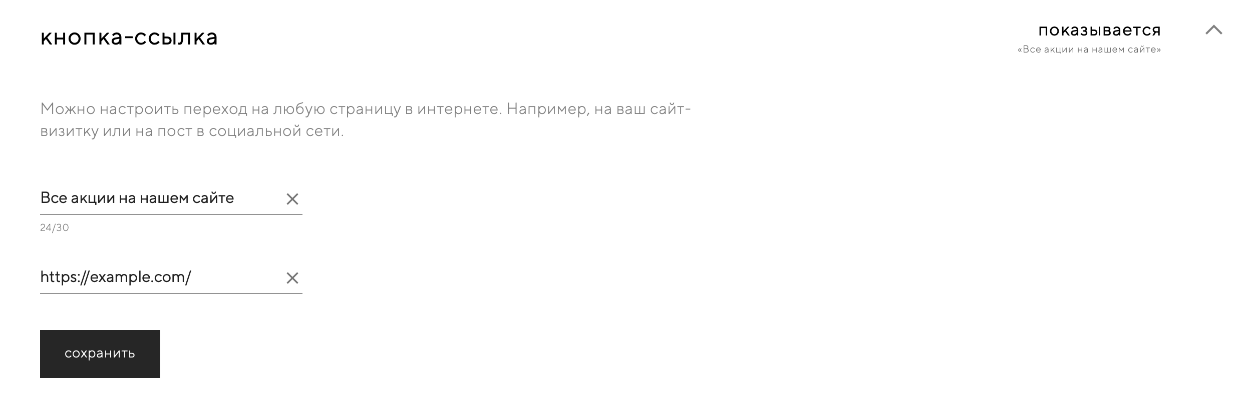 С помощью кнопки-ссылки можно настроить переход на любую страницу в интернете. Например, на ваш сайт-визитку или на пост в социальной сети.