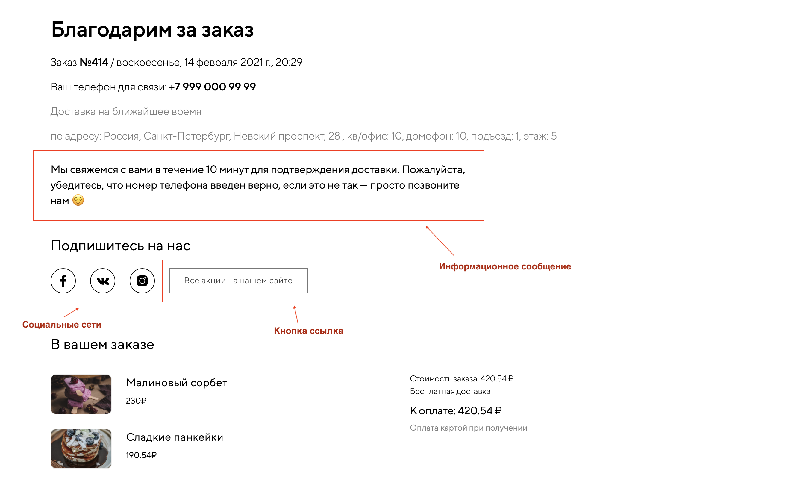 Есть и еще один плюс: страница содержит основную информацию о заказе и подталкивает гостя проверить ее: номер телефона для связи, адрес доставки, позиции, общую стоимость заказа и т.д. Если гость случайно ошибся и ввел неверные данные — он заметит это и сообщит вам по номеру телефона, размещенному на сайте.