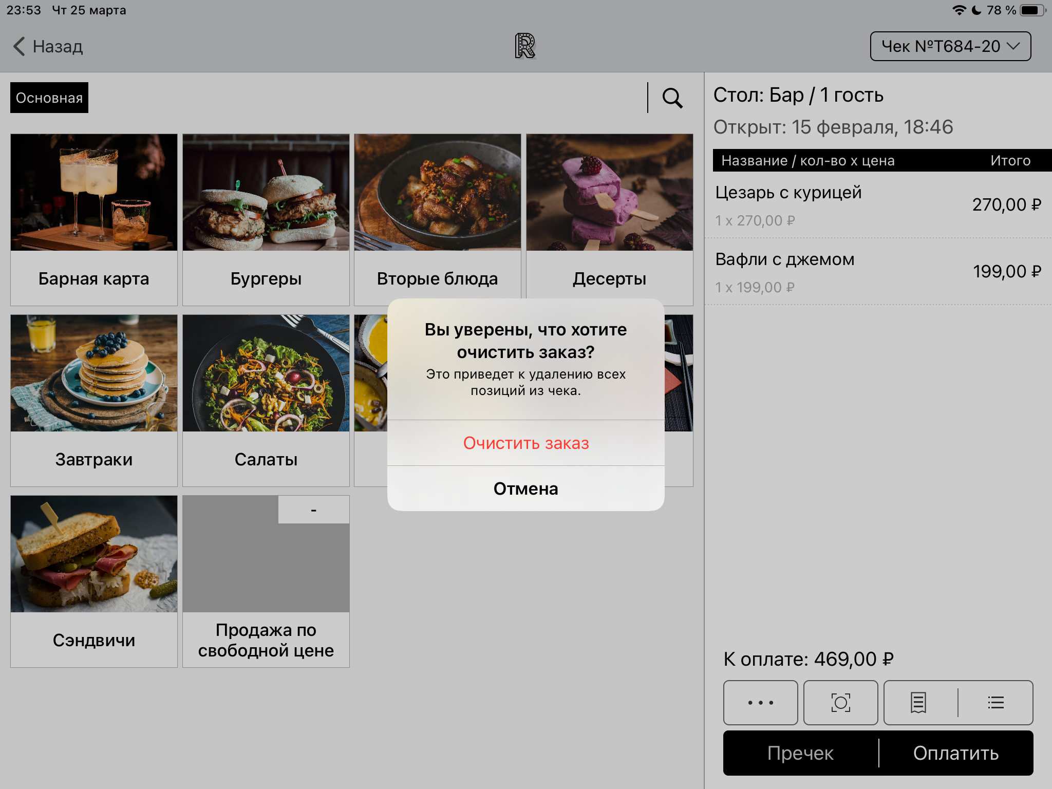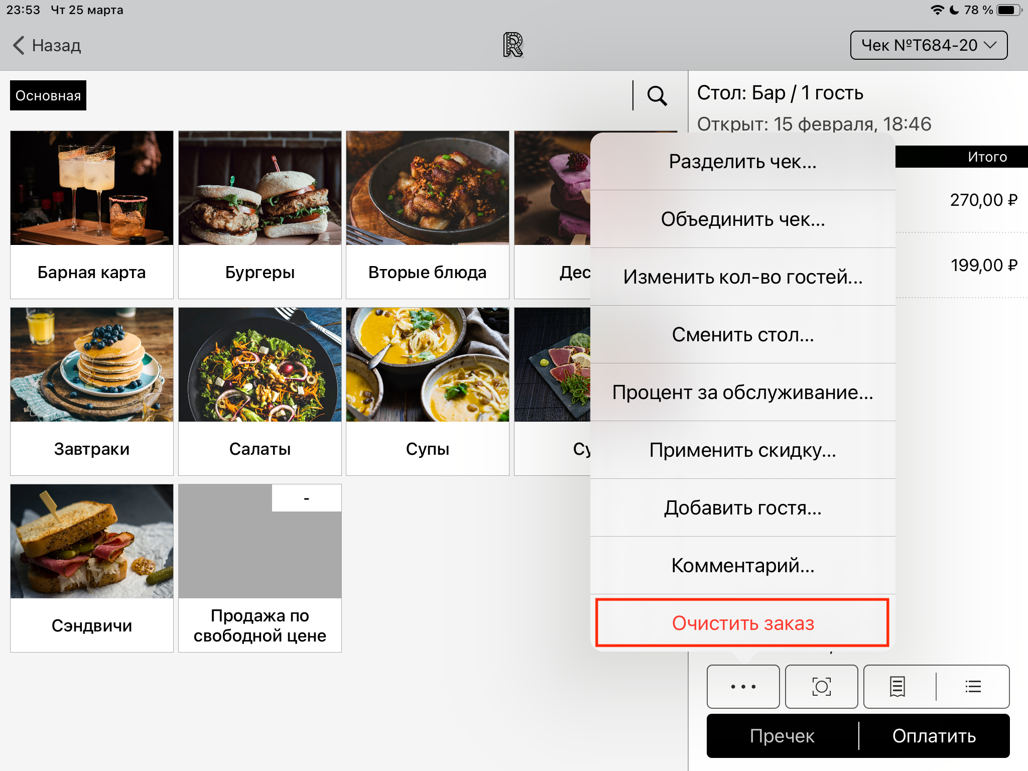 Для очистки заказа нажмите на кнопку с тремя точками в правом нижнем углу экрана чека. Затем нажмите на появившуюся кнопку «Очистить заказ».