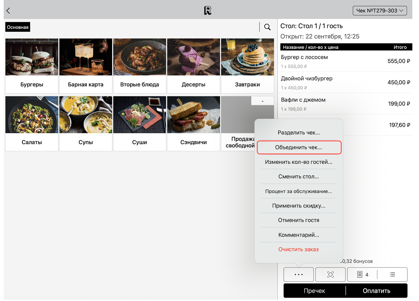 Бывают ситуации, когда гости просят объединить чек. Для того чтобы это сделать нажмите на кнопку с тремя точками в нижней части экрана, затем нажмите кнопку «Объединить чек...».
