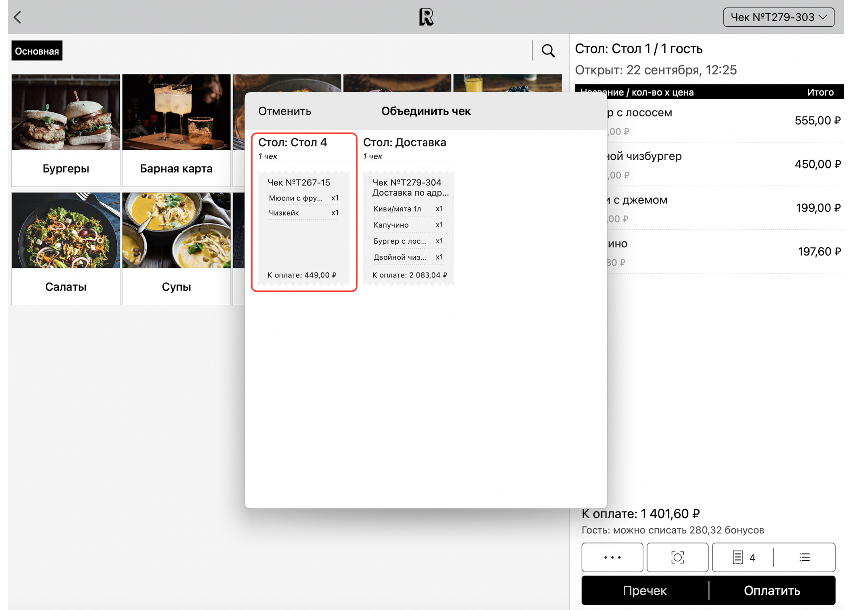 💡 Обратите внимание, настройки (к примеру, процент за обслуживание) будут применены из чека, с которым вы объединяете текущий чек.