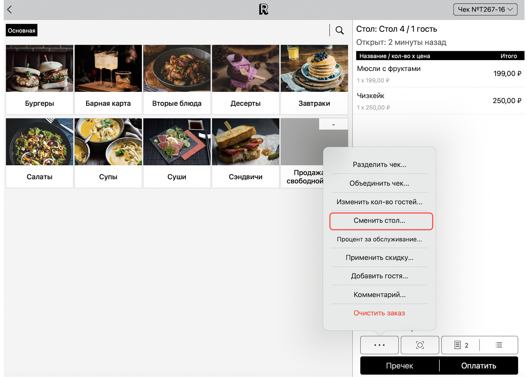 Для переноса чека на другой стол перейдите на экран чека и нажмите на кнопку с тремя точками в нижней части экрана, затем нажмите кнопку «Сменить стол...», чтобы перенести чек на другой стол.