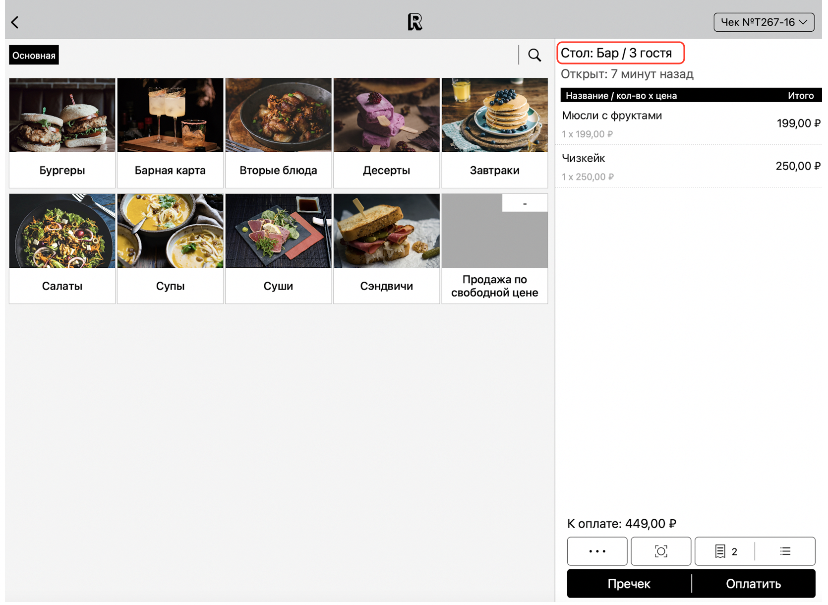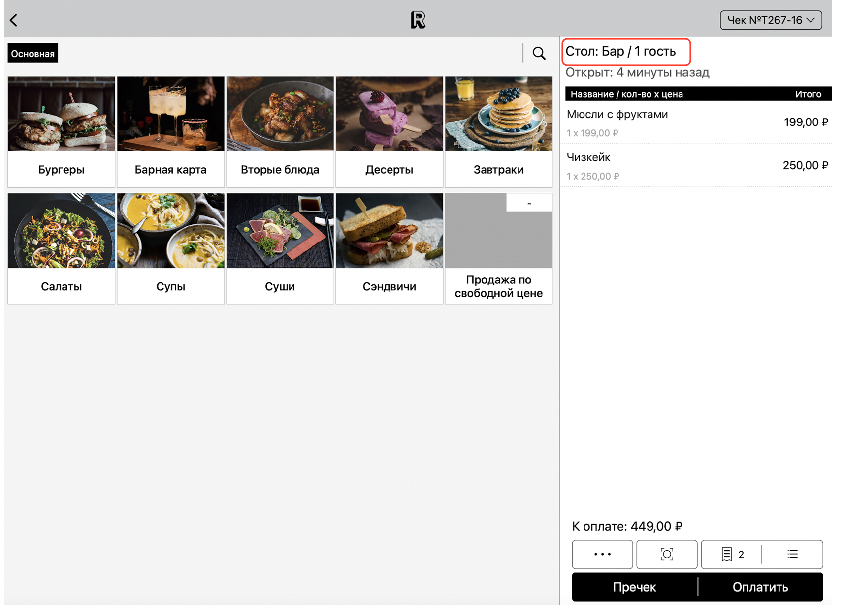 Для удобства, используйте кнопку с номером чека в правом верхнем углу экрана, чтобы переключаться между чеками, открытыми за одним столом: