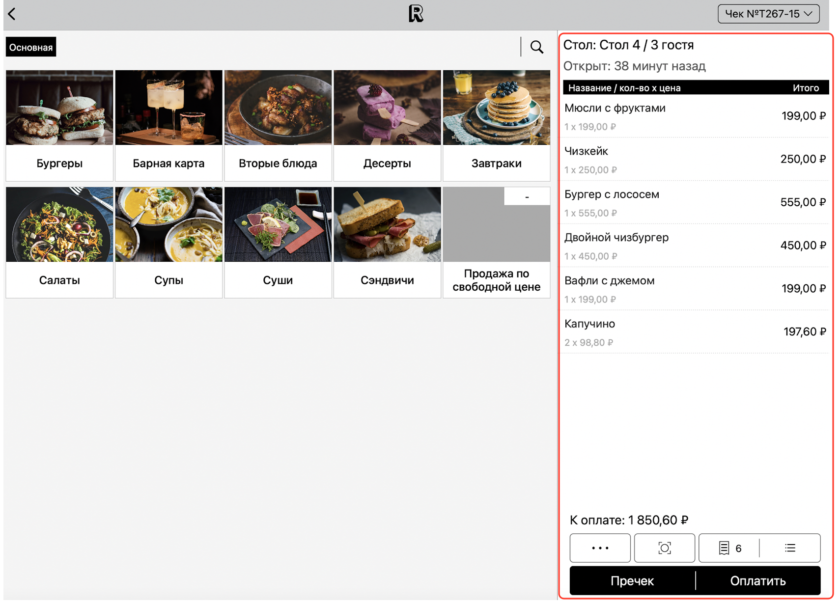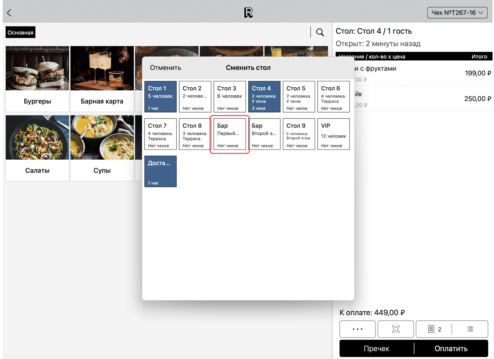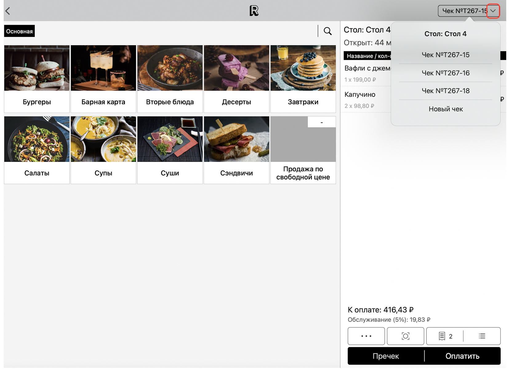Для удобства, используйте кнопку с номером чека в правом верхнем углу экрана, чтобы переключаться между чеками, открытыми за одним столом: